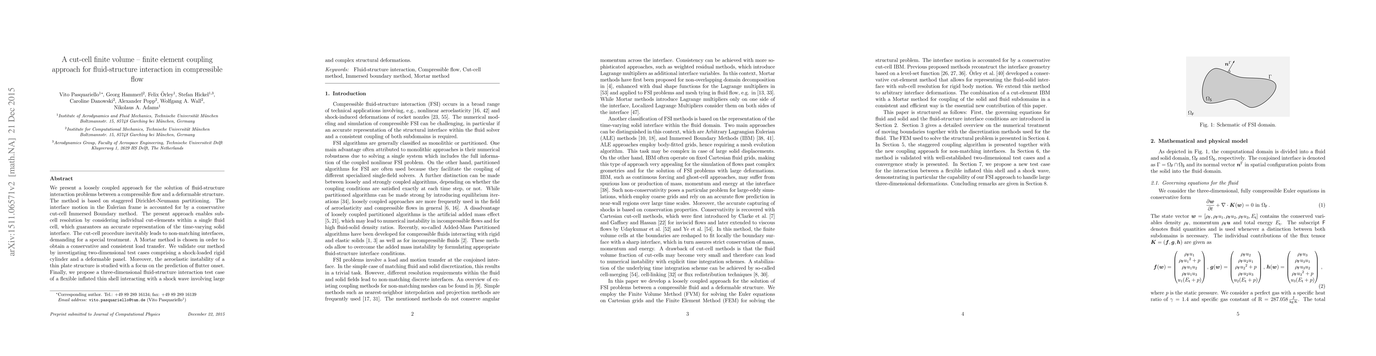 The paper proposes a novel, loosely coupled method for simulating fluid-structure interactions in compressible flows using a cut-cell finite volume-finite element approach. This technique, validated through 2D and 3D test cases, ensures accurate sub-cell resolution of deformable structures, even with complex, large deformations, and predicts phenomena like shock-loaded cylinder impact and thin plate flutter onset.
