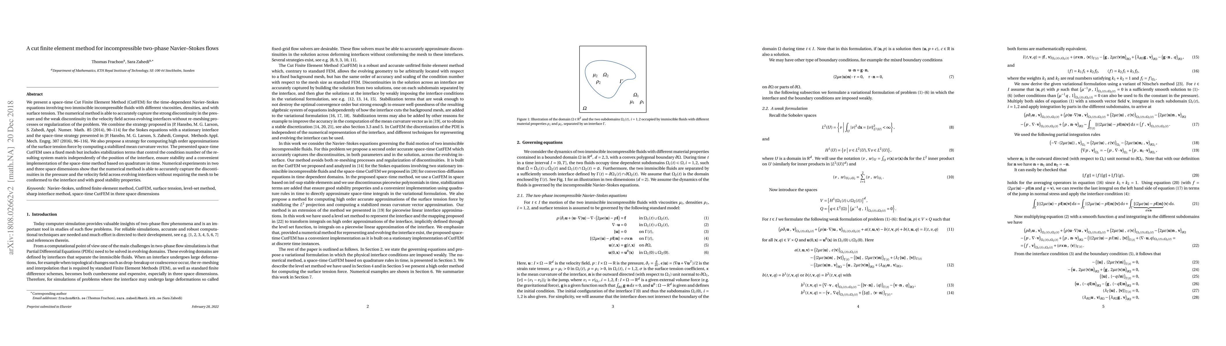 This paper introduces a space-time Cut Finite Element Method (CutFEM) for solving incompressible two-phase Navier-Stokes flows, accurately capturing discontinuities in pressure and velocity across evolving interfaces without re-meshing. The method combines existing strategies for the Stokes equations and a space-time approach, ensuring stability and accurate surface tension force computation.