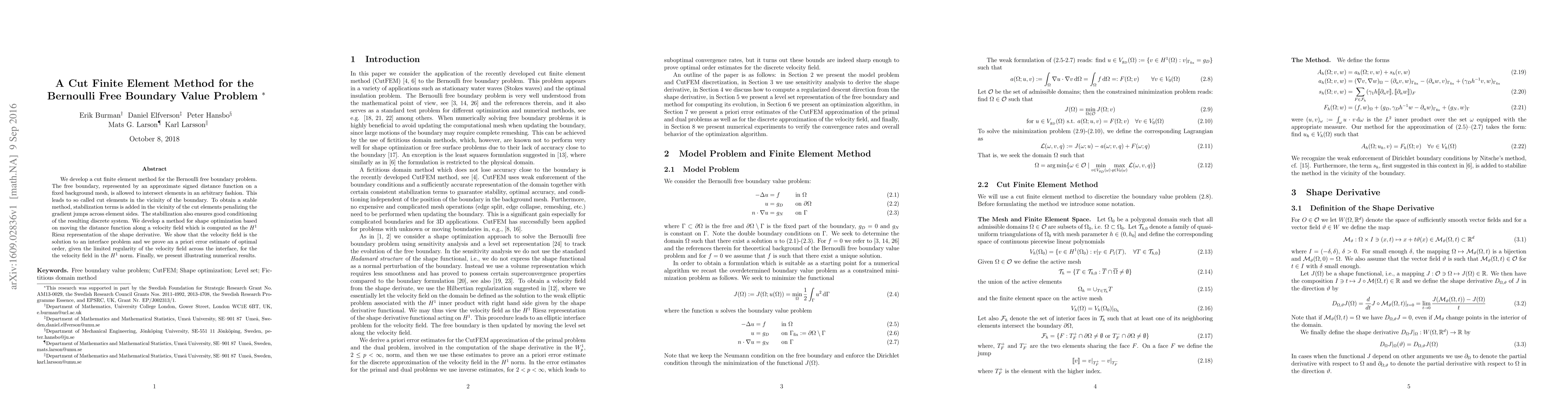 This paper introduces a cut finite element method for solving the Bernoulli free boundary problem, allowing the free boundary to intersect elements freely and adding stabilization terms to ensure stability and good conditioning. It also presents a shape optimization method based on a velocity field, proving an optimal a priori error estimate for the velocity field.