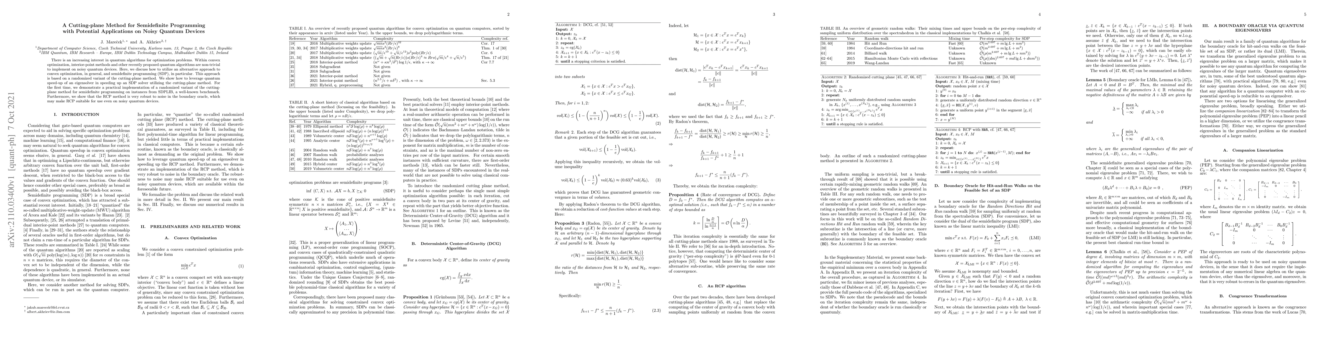 There is an increasing interest in quantum algorithms for optimization problems. Within convex optimization, interior-point methods and other recently proposed quantum algorithms are non-trivial to implement on noisy quantum devices. Here, we discuss how to utilize an alternative approach to convex optimization, in general, and semidefinite programming (SDP), in particular. This approach is based on a randomized variant of the cutting-plane method. We show how to leverage quantum speed-up of an eigensolver in speeding up an SDP solver utilizing the cutting-plane method. For the first time, we demonstrate a practical implementation of a randomized variant of the cutting-plane method for semidefinite programming on instances from SDPLIB, a well-known benchmark. Furthermore, we show that the RCP method is very robust to noise in the boundary oracle, which may make RCP suitable for use even on noisy quantum devices.
