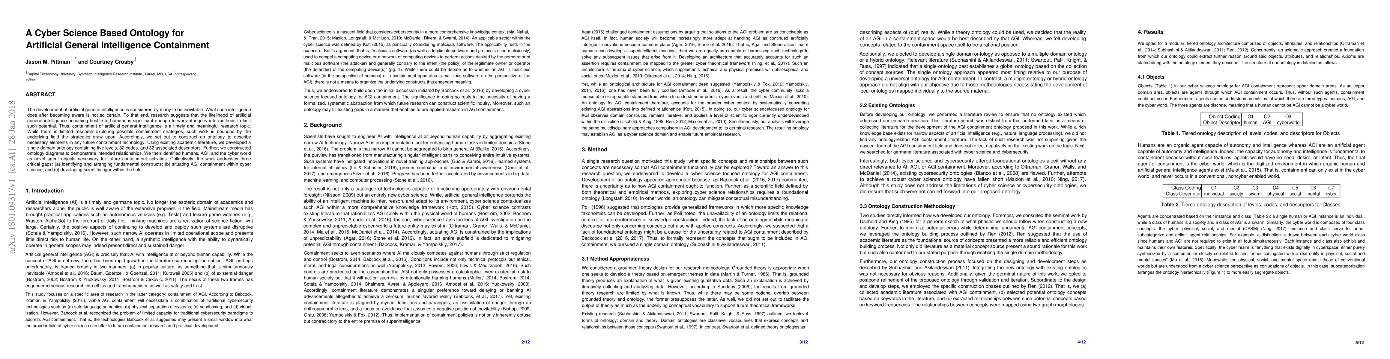 The development of artificial general intelligence is considered by many to be inevitable. What such intelligence does after becoming aware is not so certain. To that end, research suggests that the likelihood of artificial general intelligence becoming hostile to humans is significant enough to warrant inquiry into methods to limit such potential. Thus, containment of artificial general intelligence is a timely and meaningful research topic. While there is limited research exploring possible containment strategies, such work is bounded by the underlying field the strategies draw upon. Accordingly, we set out to construct an ontology to describe necessary elements in any future containment technology. Using existing academic literature, we developed a single domain ontology containing five levels, 32 codes, and 32 associated descriptors. Further, we constructed ontology diagrams to demonstrate intended relationships. We then identified humans, AGI, and the cyber world as novel agent objects necessary for future containment activities. Collectively, the work addresses three critical gaps: (a) identifying and arranging fundamental constructs; (b) situating AGI containment within cyber science; and (c) developing scientific rigor within the field.