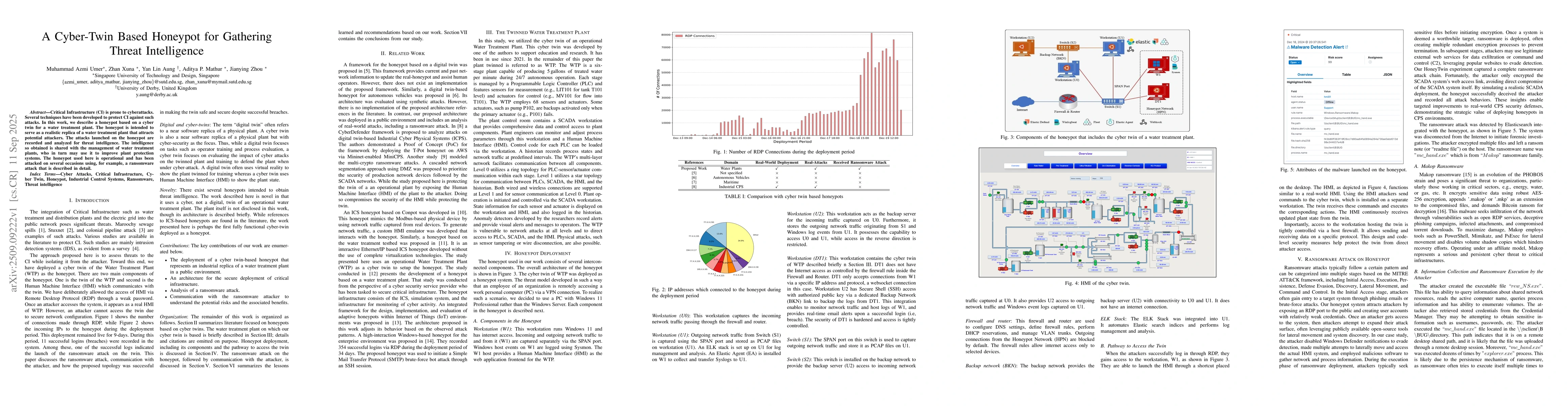 Critical Infrastructure (CI) is prone to cyberattacks. Several techniques have been developed to protect CI against such attacks. In this work, we describe a honeypot based on a cyber twin for a water treatment plant. The honeypot is intended to serve as a realistic replica of a water treatment plant that attracts potential attackers. The attacks launched on the honeypot are recorded and analyzed for threat intelligence. The intelligence so obtained is shared with the management of water treatment plants, who in turn may use it to improve plant protection systems. The honeypot used here is operational and has been attacked on several occasions using, for example, a ransomware attack that is described in detail.