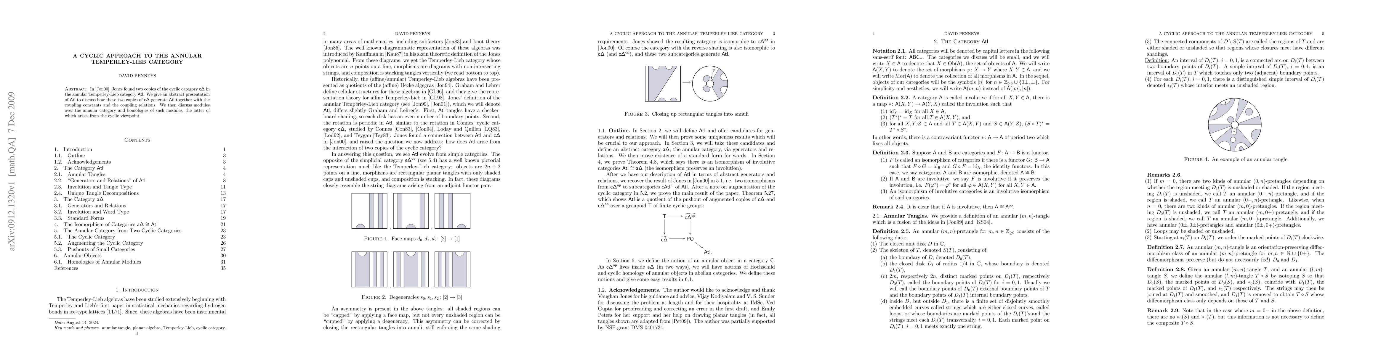 In 2000, Jones found two copies of the cyclic category in the annular Temperley-Lieb category ATL. We give an abstract presentation of ATL to discuss how these two copies of the cyclic category generate ATL together with the coupling constants and the coupling relations. We then discuss modules over the annular category and homologies of such modules, the latter of which arises from the cyclic viewpoint.