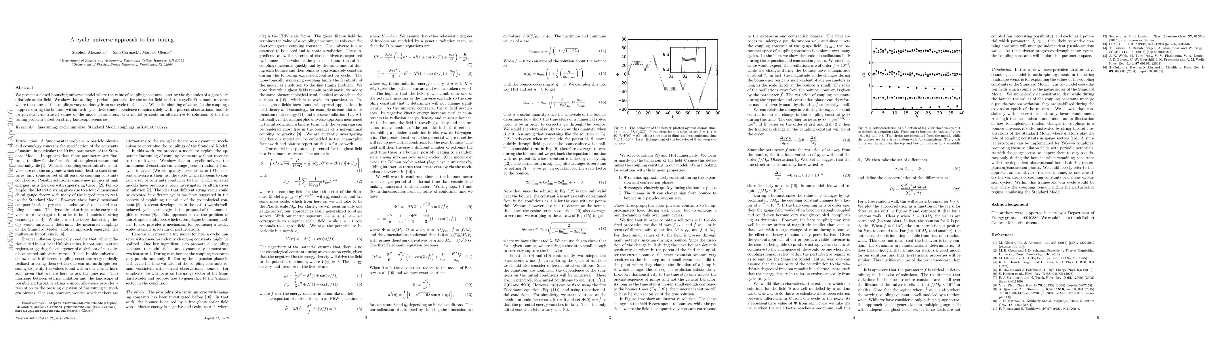 We present a closed bouncing universe model where the value of coupling constants is set by the dynamics of a ghost-like dilatonic scalar field. We show that adding a periodic potential for the scalar field leads to a cyclic Friedmann universe where the values of the couplings vary randomly from one cycle to the next. While the shuffling of values for the couplings happens during the bounce, within each cycle their time-dependence remains safely within present observational bounds for physically-motivated values of the model parameters. Our model presents an alternative to solutions of the fine tuning problem based on string landscape scenarios.