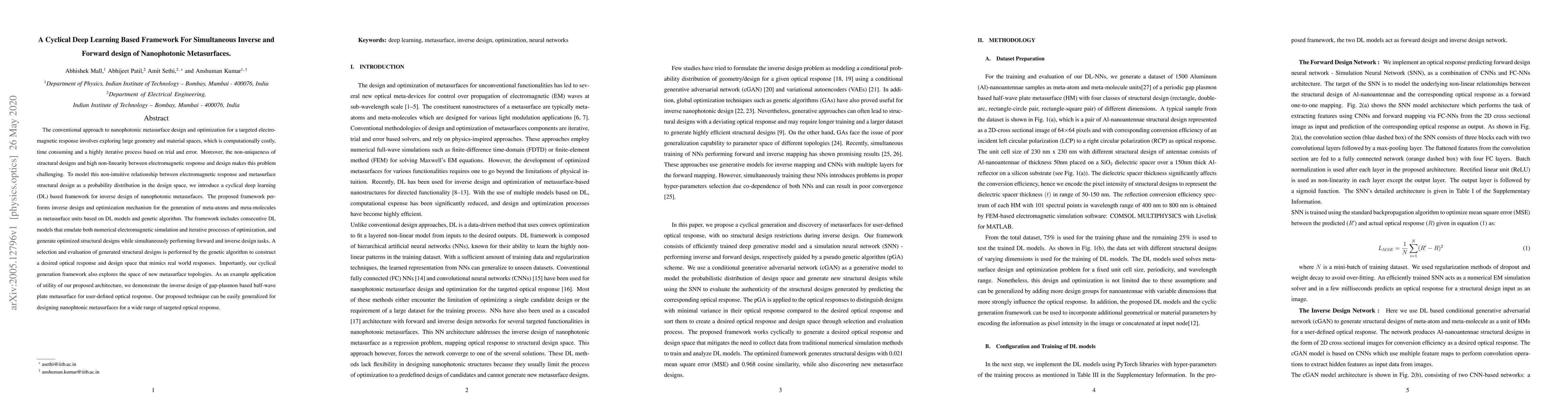 This paper introduces a cyclical deep learning framework for simultaneous inverse and forward design of nanophotonic metasurfaces, utilizing deep learning models and genetic algorithms to optimize metasurface structural designs efficiently. The proposed method explores new metasurface topologies and demonstrates the design of a gap-plasmon based half-wave plate metasurface for customized optical responses.