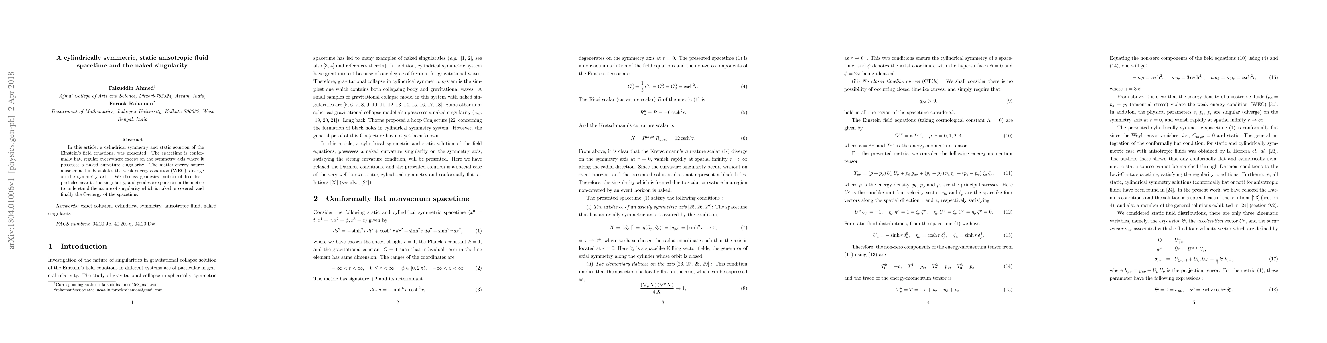 In this article, a cylindrical symmetry and static solution of the Einstein's field equations, was presented. The space-time is conformally flat, regular everywhere except on the symmetry axis where it possesses a naked curvature singularity. The matter-energy source anisotropic fluids violates the weak energy condition (WEC), diverge on the symmetry axis. We discuss geodesics motion of free test-particles near to the singularity, and geodesic expansion in the metric to understand the nature of singularity which is naked or covered, and finally the C-energy of the space-time.