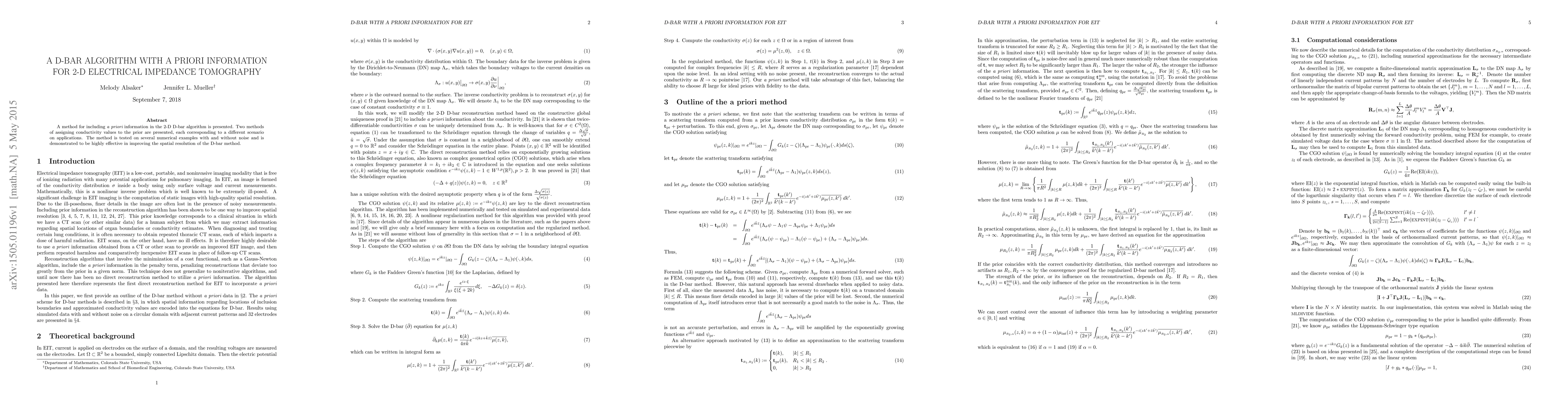 A new method is presented for using prior knowledge to improve the accuracy of the 2D D-bar algorithm in electrical impedance tomography, achieving high spatial resolution results.