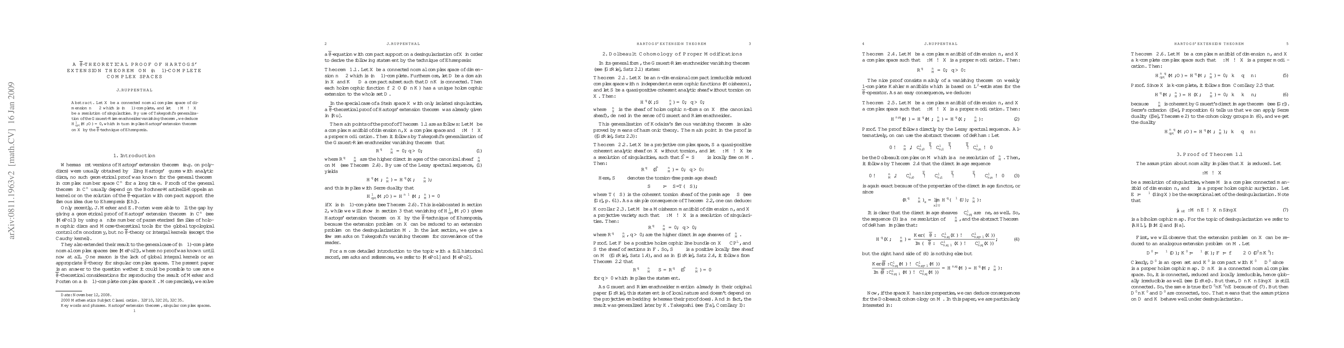 Summary: The paper proves Hartogs' extension theorem for (n-1)-complete connected normal complex spaces using a d-bar-theoretical approach, leveraging Takegoshi's vanishing theorem to establish H^1_{cpt}(M,O)=0, thereby extending the theorem via Ehrenpreis's d-bar technique.