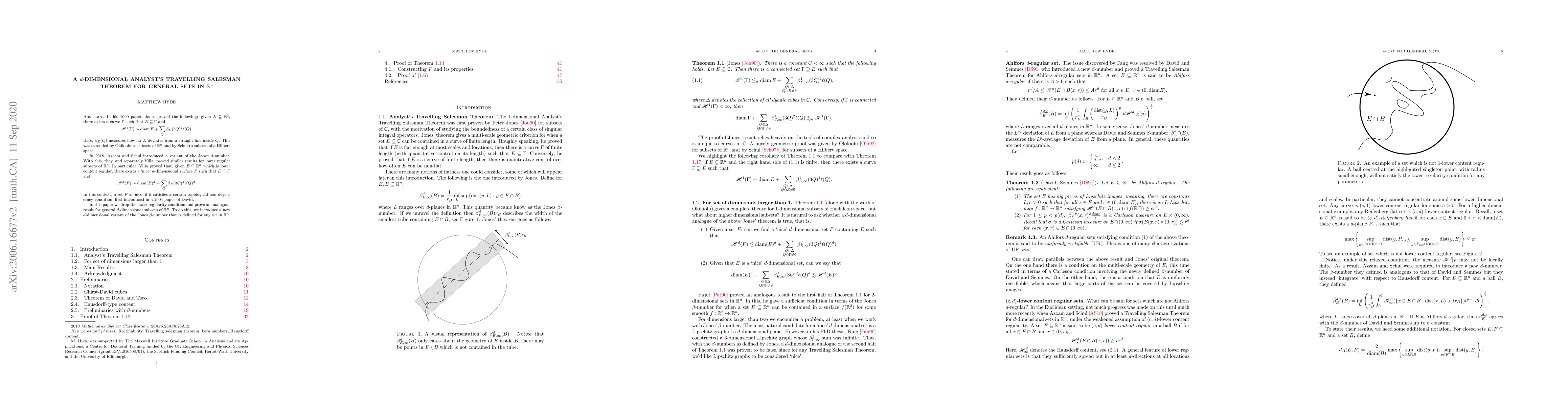 This paper extends the Travelling Salesman Theorem to $d$-dimensional subsets in $\mathbb{R}^n$, proving the existence of a "nice" $d$-dimensional surface $F$ containing $E$ such that $\mathscr{H}^d(F)$ is asymptotically equivalent to $\text{diam}(E)^d$ plus a term involving a new $d$-dimensional $\beta$-number. This generalizes previous results that required lower regularity conditions.