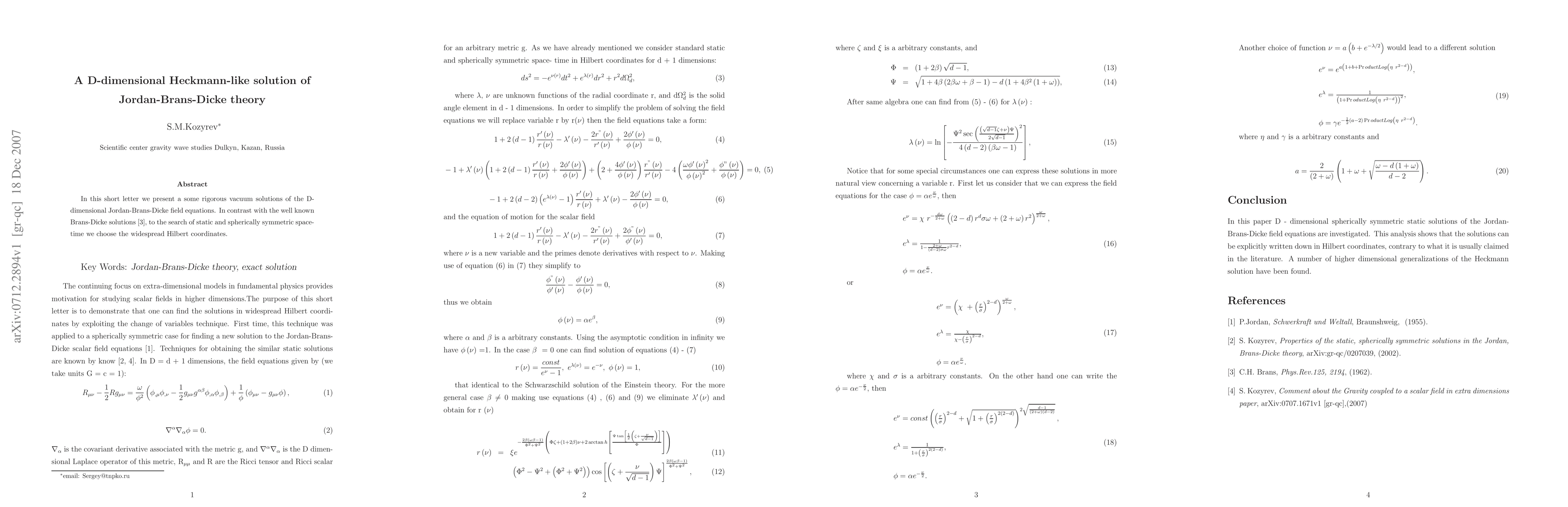 In this short letter we present a some rigorous vacuum solutions of the D-dimensional Jordan-Brans-Dicke field equations. In contrast with the well known Brans-Dicke solutions, to the search of static and spherically symmetric space-time we choose the widespread Hilbert coordinates.