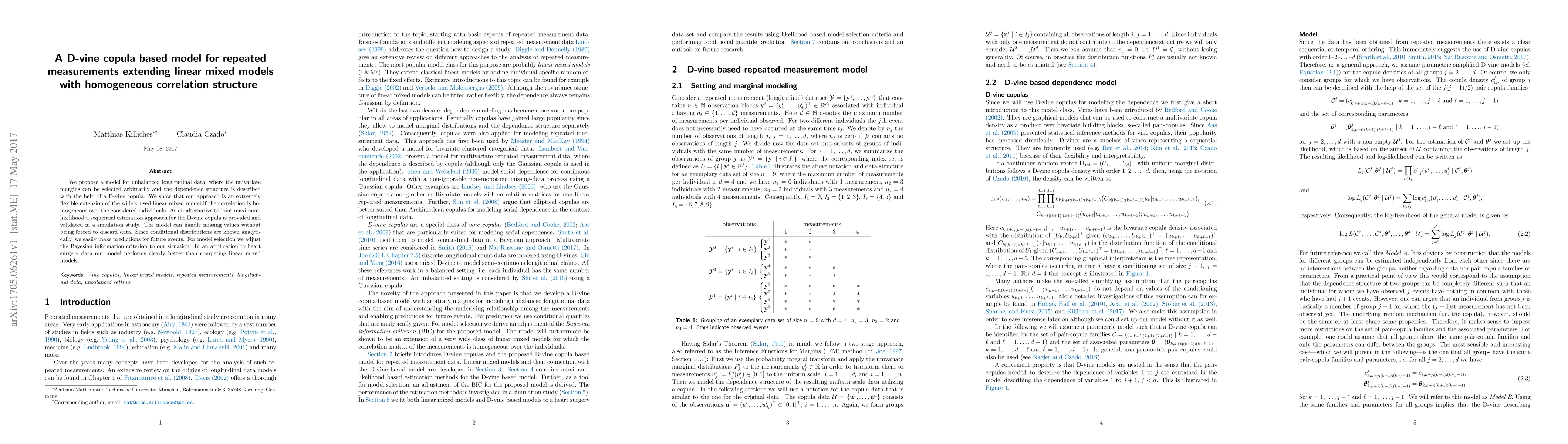We propose a model for unbalanced longitudinal data, where the univariate margins can be selected arbitrarily and the dependence structure is described with the help of a D-vine copula. We show that our approach is an extremely flexible extension of the widely used linear mixed model if the correlation is homogeneous over the considered individuals. As an alternative to joint maximum-likelihood a sequential estimation approach for the D-vine copula is provided and validated in a simulation study. The model can handle missing values without being forced to discard data. Since conditional distributions are known analytically, we easily make predictions for future events. For model selection we adjust the Bayesian information criterion to our situation. In an application to heart surgery data our model performs clearly better than competing linear mixed models.