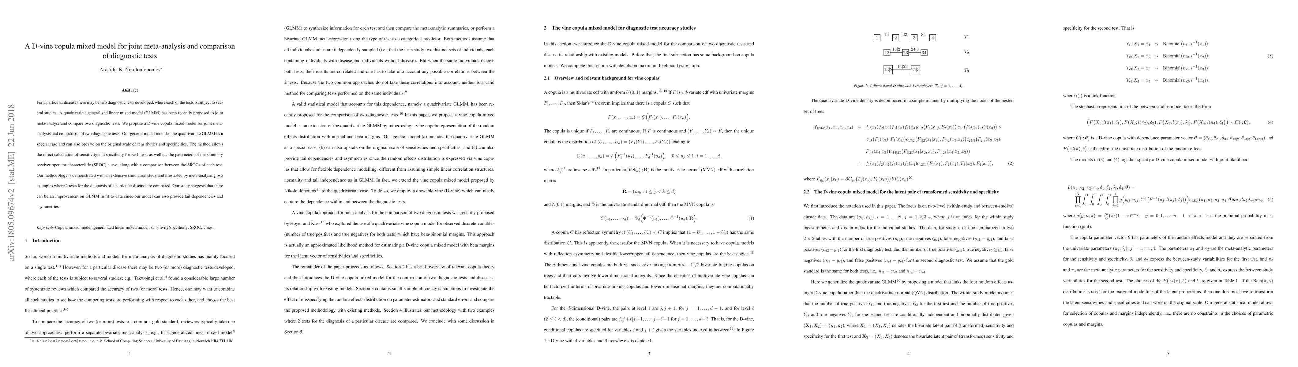 This paper proposes a D-vine copula mixed model for joint meta-analysis and comparison of two diagnostic tests, improving upon the quadrivariate generalized linear mixed model by allowing for tail dependencies and asymmetries. The method facilitates the direct calculation of sensitivity, specificity, and summary receiver operator characteristic curve parameters, demonstrated through simulations and real-world examples.