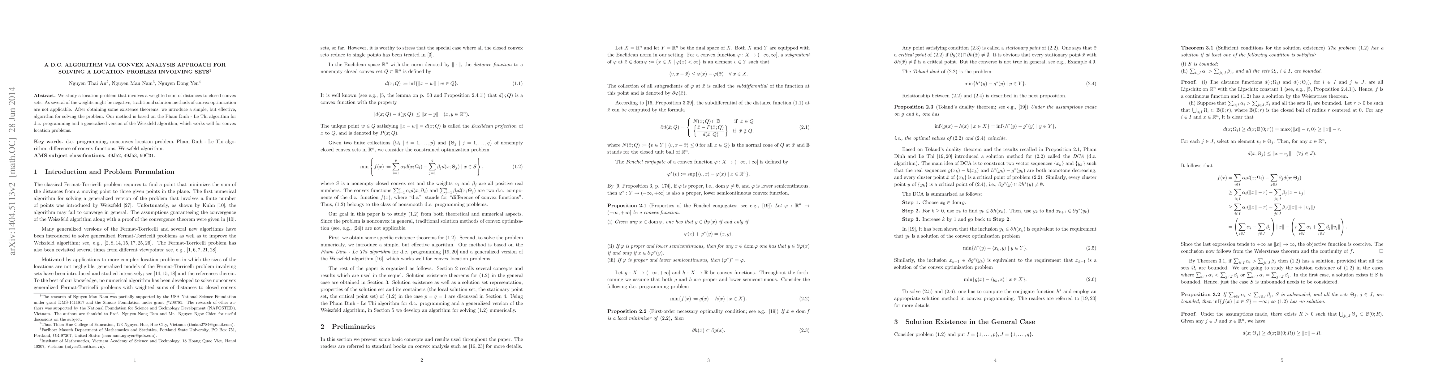 This paper proposes a novel algorithm for solving a location problem involving a weighted sum of distances to closed convex sets, where some weights may be negative. The method combines the Pham Dinh-Le Thi algorithm for d.c. programming with a generalized Weiszfeld algorithm, offering an effective solution to this non-traditional convex optimization problem.