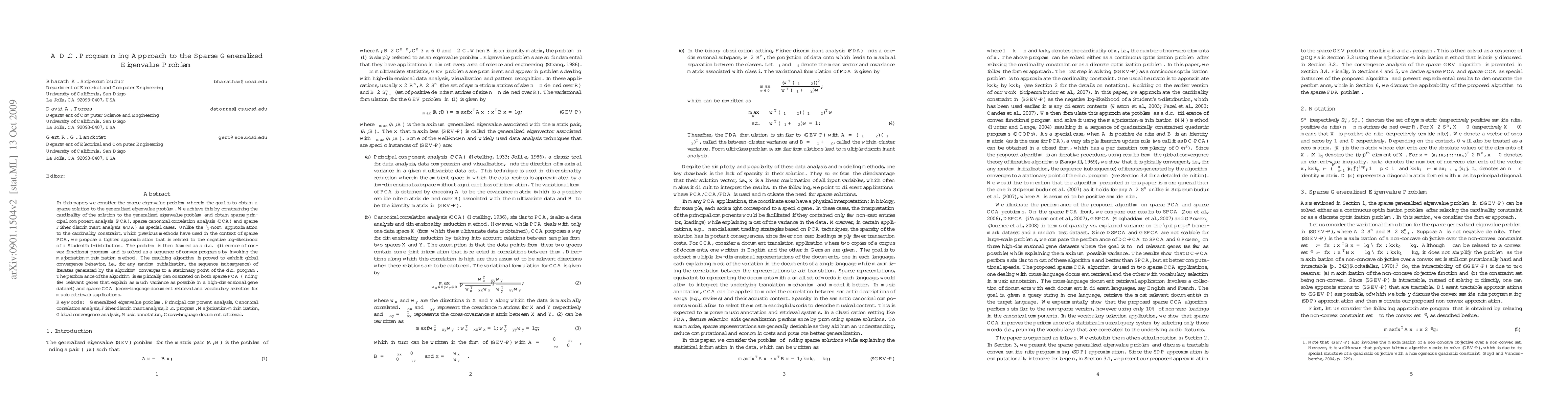 In this paper, we consider the sparse eigenvalue problem wherein the goal is to obtain a sparse solution to the generalized eigenvalue problem. We achieve this by constraining the cardinality of the solution to the generalized eigenvalue problem and obtain sparse principal component analysis (PCA), sparse canonical correlation analysis (CCA) and sparse Fisher discriminant analysis (FDA) as special cases. Unlike the $\ell_1$-norm approximation to the cardinality constraint, which previous methods have used in the context of sparse PCA, we propose a tighter approximation that is related to the negative log-likelihood of a Student's t-distribution. The problem is then framed as a d.c. (difference of convex functions) program and is solved as a sequence of convex programs by invoking the majorization-minimization method. The resulting algorithm is proved to exhibit \emph{global convergence} behavior, i.e., for any random initialization, the sequence (subsequence) of iterates generated by the algorithm converges to a stationary point of the d.c. program. The performance of the algorithm is empirically demonstrated on both sparse PCA (finding few relevant genes that explain as much variance as possible in a high-dimensional gene dataset) and sparse CCA (cross-language document retrieval and vocabulary selection for music retrieval) applications.