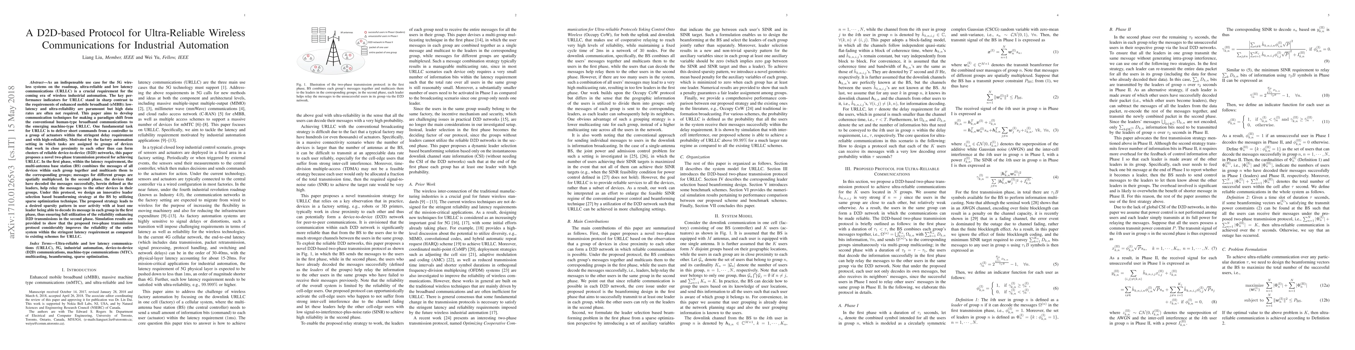 As one indispensable use case for the 5G wireless systems on the roadmap, ultra-reliable and low latency communications (URLLC) is a crucial requirement for the coming era of wireless industrial automation. This paper aims to develop communication techniques for making such a paradigm shift from the conventional human-type broadband communications to the emerging machine-type URLLC. One fundamental task for URLLC is to deliver a short command from the controller to each actuator within the stringent delay requirement and also with high-reliability in the downlink. Motivated by the geographic feature in industrial automation that in the factories many tasks are assigned to different groups of devices who work in close proximity to each other and thus can form clusters of reliable device-to-device (D2D) networks, this paper proposes a novel two-phase transmission protocol for achieving the above goal. Specifically, in the first phase within the latency requirement, the multi-antenna base station (BS) combines the messages of each group together and multicasts them to the corresponding groups; while in the second phase, the devices that have decoded the messages successfully, who are defined as the leaders, help relay the messages to the other devices in their groups. Under this protocol, we further design an innovative leader selection based beamforming strategy at the BS by utilizing the sparse optimization technique, which leads to the desired sparsity pattern in user activity, i.e., at least one leader exists in each group, in the first phase, thus making full utilization of the reliable D2D networks in the second phase. Simulation results are provided to show that the proposed two-phase transmission protocol considerably improves the reliability of the whole system within the stringent latency requirement as compared to other existing schemes for URLLC such as Occupy CoW.