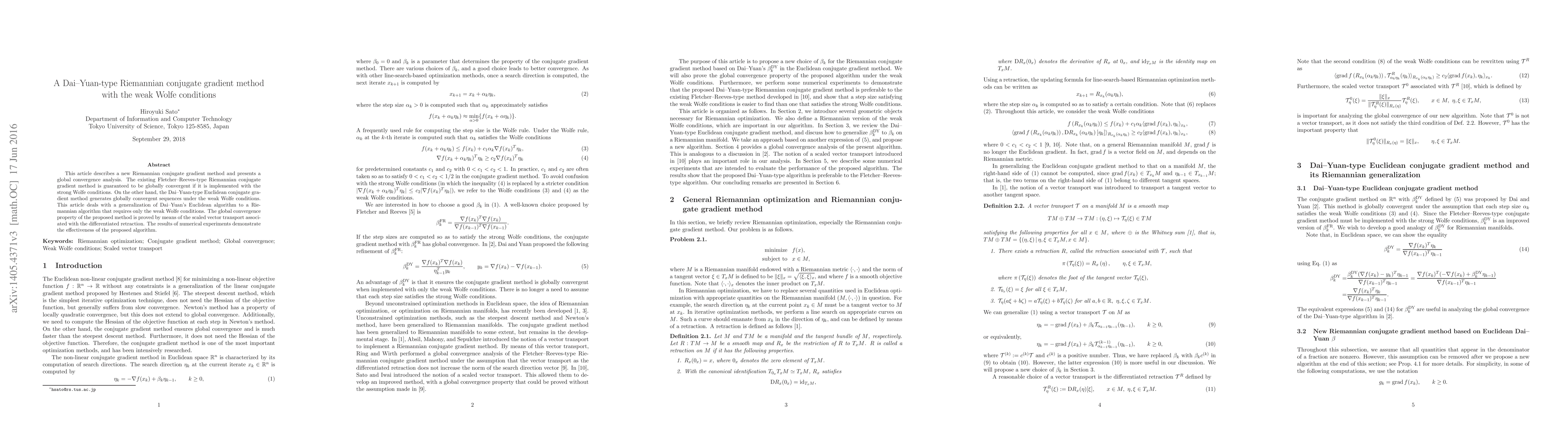 This paper introduces a new Dai-Yuan-type Riemannian conjugate gradient method that converges globally under weak Wolfe conditions, generalizing the Euclidean algorithm to Riemannian geometry. The method's global convergence is proven using scaled vector transport and numerical experiments validate its effectiveness.