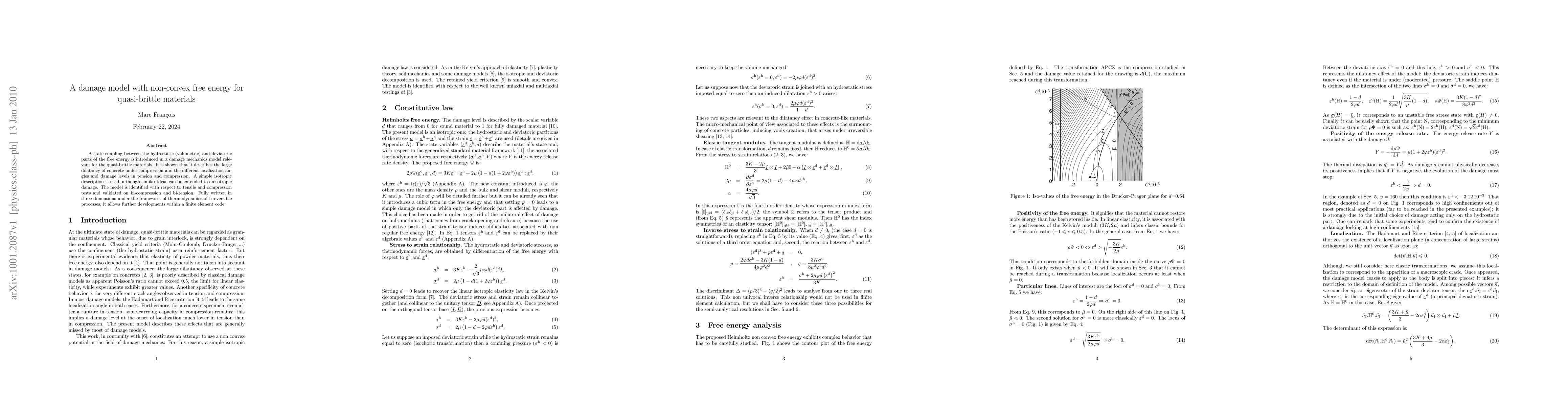 This paper proposes a damage mechanics model for quasi-brittle materials that couples hydrostatic and deviatoric free energy components, accurately describing concrete's dilatancy under compression and differing damage behaviors in tension and compression. The model is validated through various tests and can be integrated into finite element simulations.