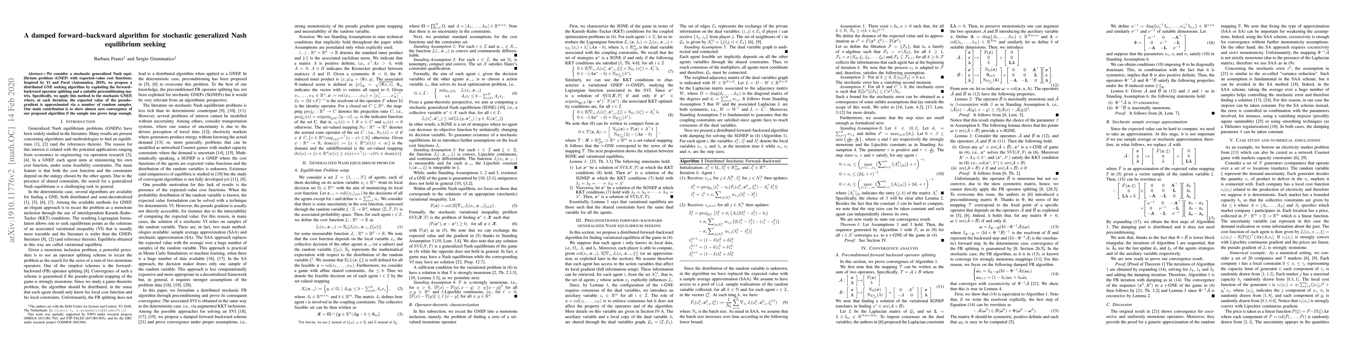 This paper proposes a damped forward-backward algorithm for solving stochastic generalized Nash equilibrium problems (GNEPs) with expected-value cost functions. The method leverages random samples to approximate the pseudo-gradient and demonstrates almost sure convergence under sufficient sample size.