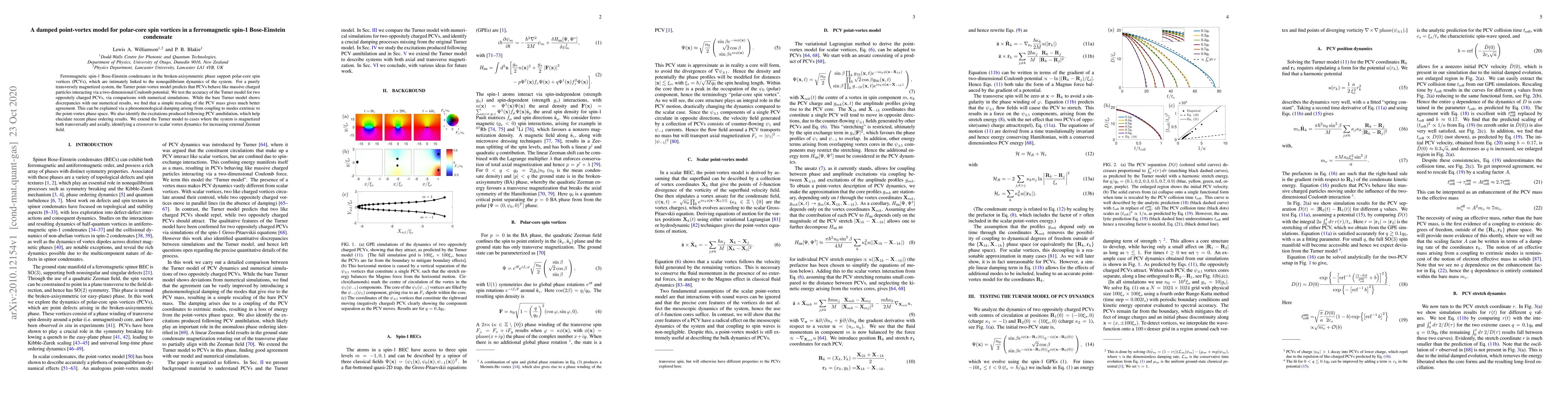 Ferromagnetic spin-1 Bose-Einstein condensates in the broken-axisymmetric phase support polar-core spin vortices (PCVs), which are intimately linked to the nonequilibrium dynamics of the system. For a purely transversely magnetized system, the Turner point-vortex model predicts that PCVs behave like massive charged particles interacting via a two-dimensional Coulomb potential. We test the accuracy of the Turner model for two oppositely charged PCVs, via comparisons with numerical simulations. While the bare Turner model shows discrepancies with our numerical results, we find that a simple rescaling of the PCV mass gives much better agreement. This can be explained via a phenomenological damping arising from coupling to modes extrinsic to the point-vortex phase space. We also identify the excitations produced following PCV annihilation, which help elucidate recent phase ordering results. We extend the Turner model to cases where the system is magnetized both transversally and axially, identifying a crossover to scalar vortex dynamics for increasing external Zeeman field.