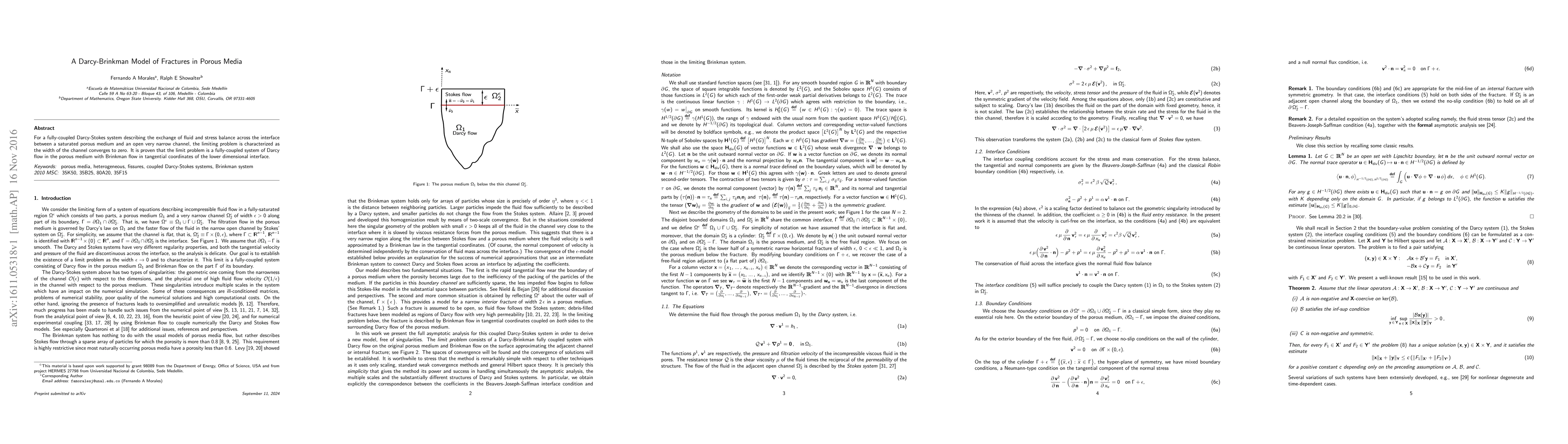 For a fully-coupled Darcy-Stokes system describing the exchange of fluid and stress balance across the interface between a saturated porous medium and an open very narrow channel, the limiting problem is characterized as the width of the channel converges to zero. It is proven that the limit problem is a fully-coupled system of Darcy flow in the porous medium with Brinkman flow in tangential coordinates of the lower dimensional interface.