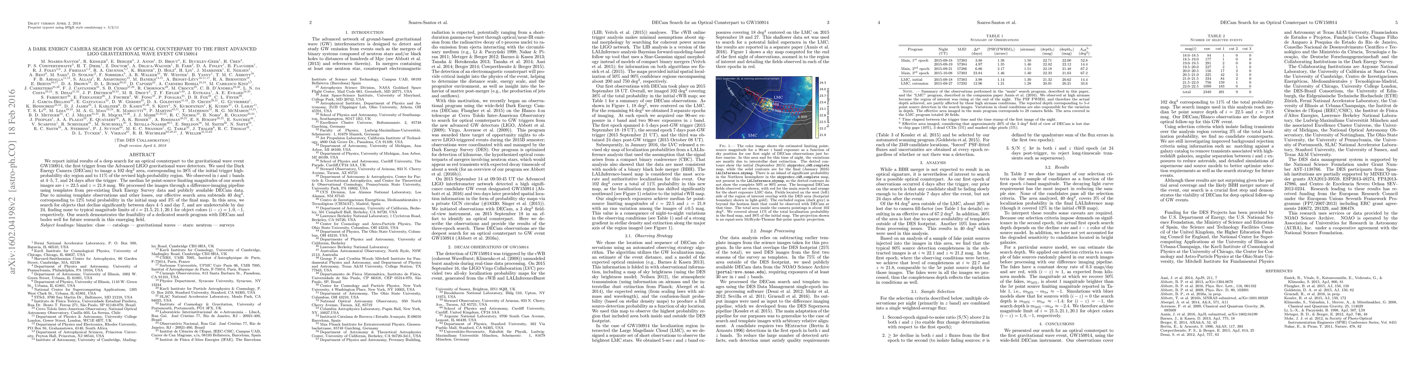 This study, using the Dark Energy Camera (DECam), searched for an optical counterpart to the first gravitational wave event GW150914. Observations were made in the i and z bands, with no significant, fading objects detected within typical magnitude limits. The research highlights the potential of DECam for future optical counterpart searches following gravitational wave detections.