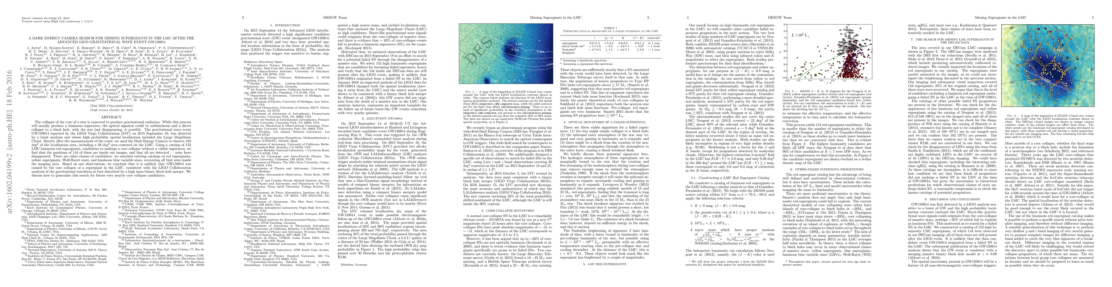 The collapse of the core of a star is expected to produce gravitational radiation. While this process will usually produce a luminous supernova, the optical signatue could be subluminous and a direct collapse to a black hole, with the star just disappearing, is possible. The gravitational wave event GW150914 reported by the LIGO Virgo Collaboration (LVC) on 2015 September 16, was detected by a burst analysis and whose high probability spatial localization included the Large Magellanic Cloud. Shortly after the announcement of the event, we used the Dark Energy Camera to observe 102 deg$^2$ of the localization area, including a 38 deg$^2$ area centered on the LMC. Using a catalog of 152 LMC luminous red supergiants, candidates to undergo a core collapse without a visible supernova, we find that the positions of 144 of these are inside our images, and that all are detected - none have disappeared. There are other classes of candidates: we searched existing catalogs of red supergiants, yellow supergiants, Wolf-Rayet stars, and luminous blue variable stars, recovering all that were inside the imaging area. Based on our observations, we conclude that it is unlikely that GW150914 was caused by the core collapse of a supergiant in the LMC, consistent with the LIGO Collaboration analyses of the gravitational wave form as best described by a binary black hole merger. We discuss how to generalize this search for future very nearby core collapse candidates.