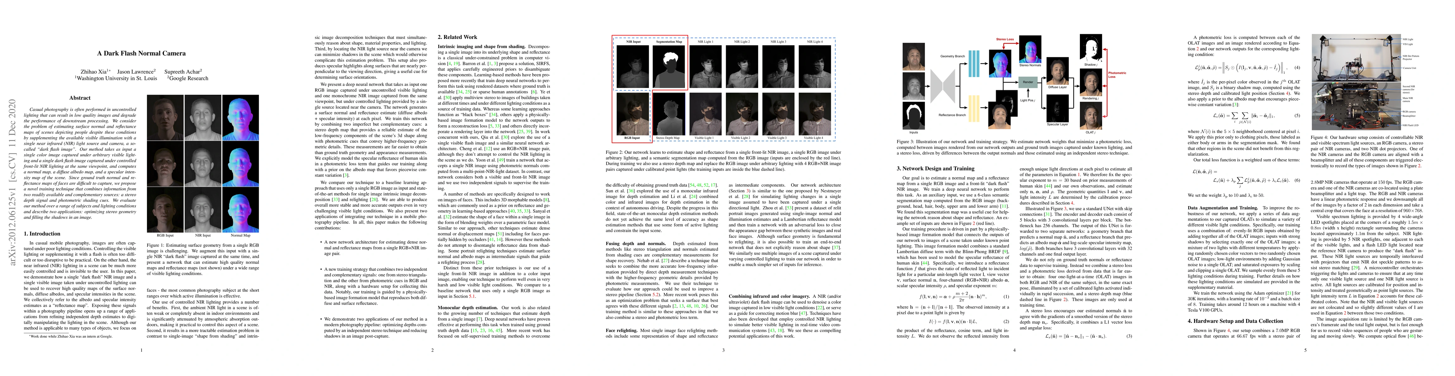 This paper proposes a method to estimate surface normal and reflectance maps for scenes with people under uncontrolled lighting using a single near infrared light source and camera. The approach combines a visible color image and a "dark flash" NIR image to compute normal, albedo, and specular maps, leveraging stereo depth and photometric cues for training.