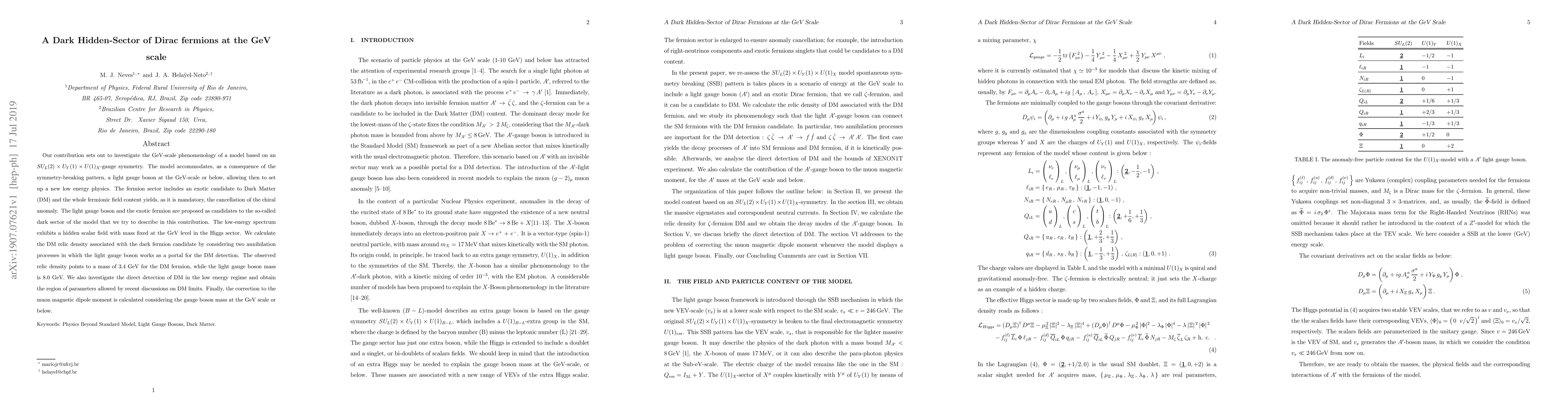 Our contribution sets out to investigate the GeV-scale phenomenology of a model based on an $SU_{L}(2) \times U_{Y}(1) \times U(1)_{X}$-gauge symmetry. The model accommodates, as a consequence of the symmetry-breaking pattern, a light gauge boson at the GeV-scale or below, allowing then to set up a new low energy physics. The fermion sector includes an exotic candidate to Dark Matter (DM) and the whole fermionic field content yields, as it is mandatory, the cancellation of the chiral anomaly. %In this strict sense, we refer to our proposal as a unified description : two different and exclusive symmetry-breaking patterns are treated with a single Lagrangian density and a common symmetry group. Furthermore, The light gauge boson and the exotic fermion are proposed as candidates to the so-called dark sector of the model that we try to describe in this contribution. The low-energy spectrum exhibits a hidden scalar field with mass fixed at the GeV level in the Higgs sector. We calculate the DM relic density associated with the dark fermion candidate by considering two annihilation processes in which the light gauge boson works as a portal for the DM detection. The observed relic density points to a mass of $3.4$ GeV for the DM fermion, while the light gauge boson mass is $8.0$ GeV. We also investigate the direct detection of DM in the low energy regime and obtain the region of parameters allowed by recent discussions on DM limits. Finally, the correction to the muon magnetic dipole moment is calculated considering the gauge boson mass at the GeV scale or below.