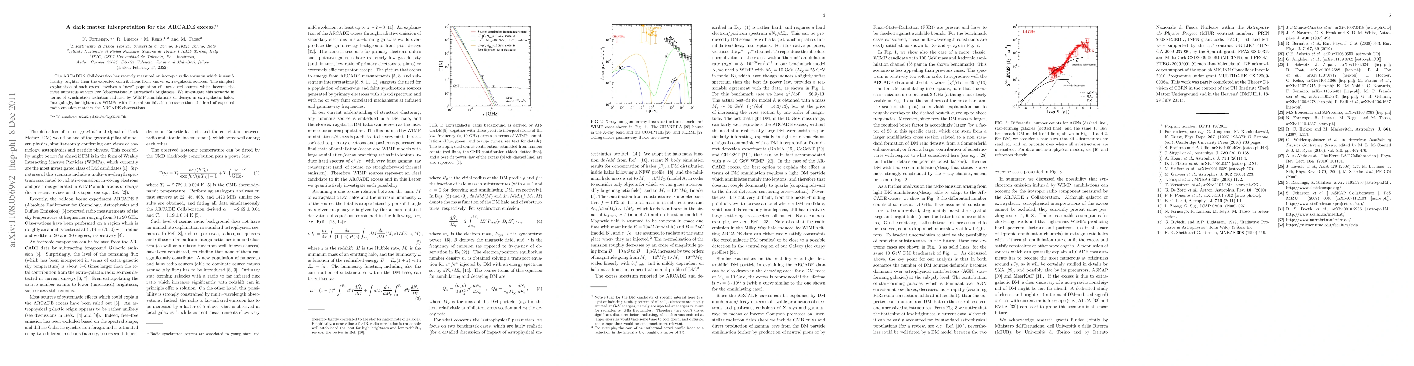 The ARCADE 2 Collaboration has recently measured an isotropic radio emission which is significantly brighter than the expected contributions from known extra-galactic sources. The simplest explanation of such excess involves a "new" population of unresolved sources which become the most numerous at very low (observationally unreached) brightness. We investigate this scenario in terms of synchrotron radiation induced by WIMP annihilations or decays in extragalactic halos. Intriguingly, for light-mass WIMPs with thermal annihilation cross-section, and fairly conservative clustering assumptions, the level of expected radio emission matches the ARCADE observations.
