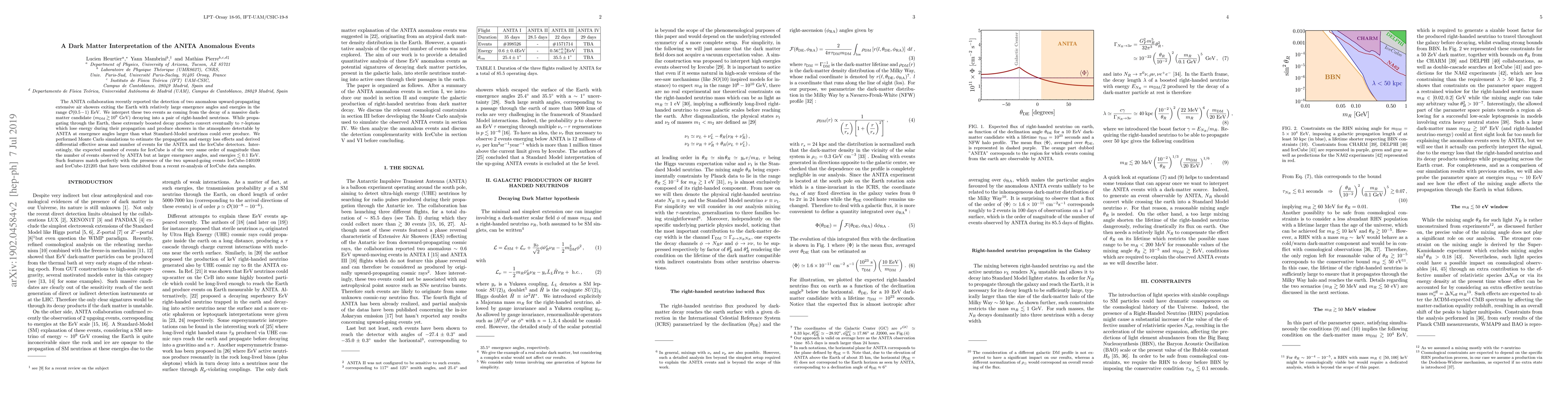 This paper interprets two anomalous upward-propagating air showers detected by ANITA as decays of a massive dark-matter particle into right-handed neutrinos, which then convert to detectable tau-leptons. The study finds a consistent match with IceCube data, suggesting a similar dark-matter origin for some IceCube events.
