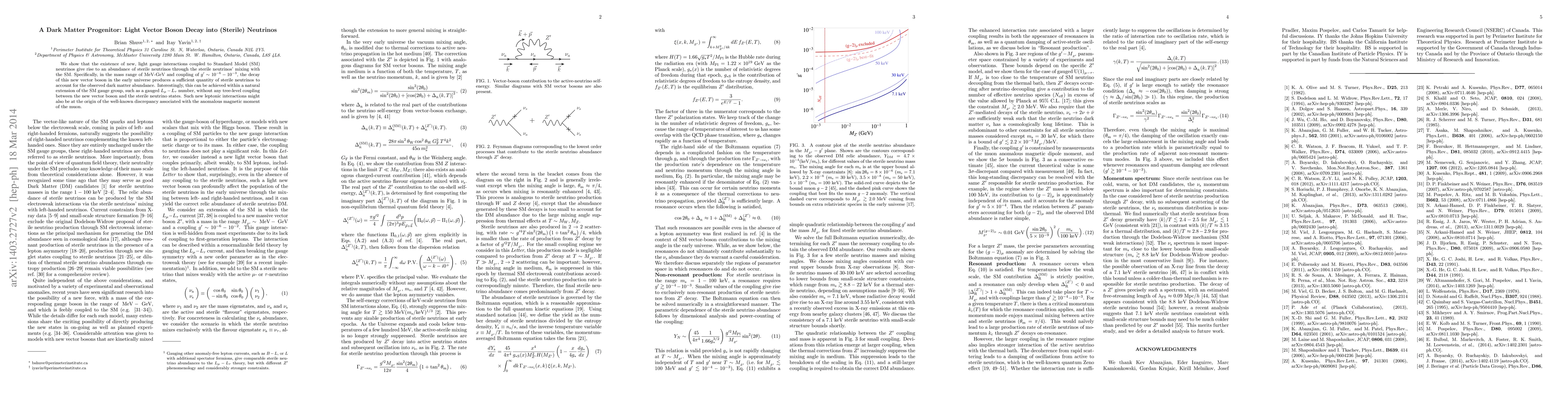 This paper proposes that light vector bosons decaying in the early universe can generate an abundance of sterile neutrinos, which could account for the observed dark matter. The new gauge interactions, within a mass range of MeV-GeV and coupling strengths of $g' \sim 10^{-6} - 10^{-2}$, naturally extend the Standard Model without direct tree-level coupling between the vector boson and sterile neutrinos.