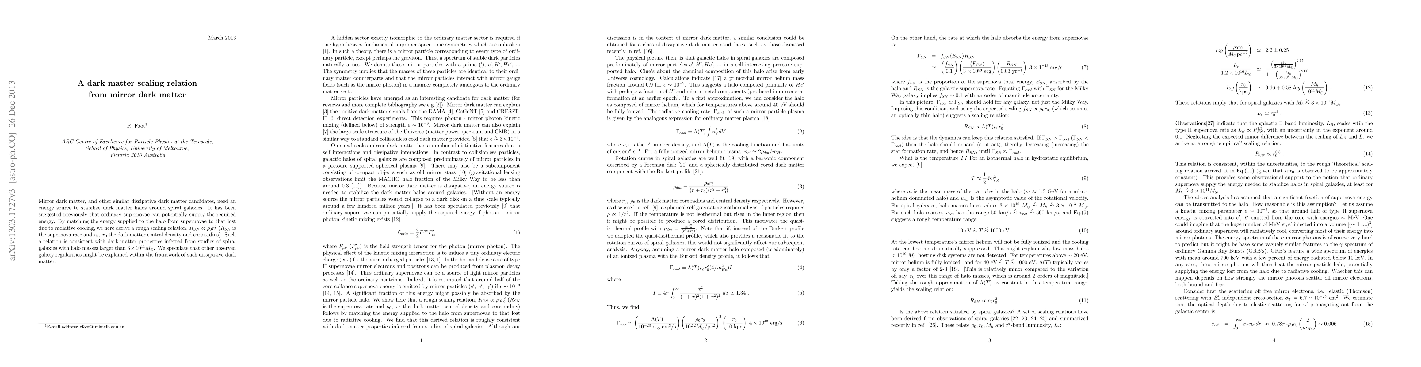 This paper derives a scaling relation for mirror dark matter in spiral galaxies, suggesting that supernovae energy can stabilize dark matter halos. The derived relation $R_{SN} \propto \rho_0 r_0^2$ aligns with dark matter properties in large galaxies, hinting at broader galaxy regularities explained by dissipative dark matter.