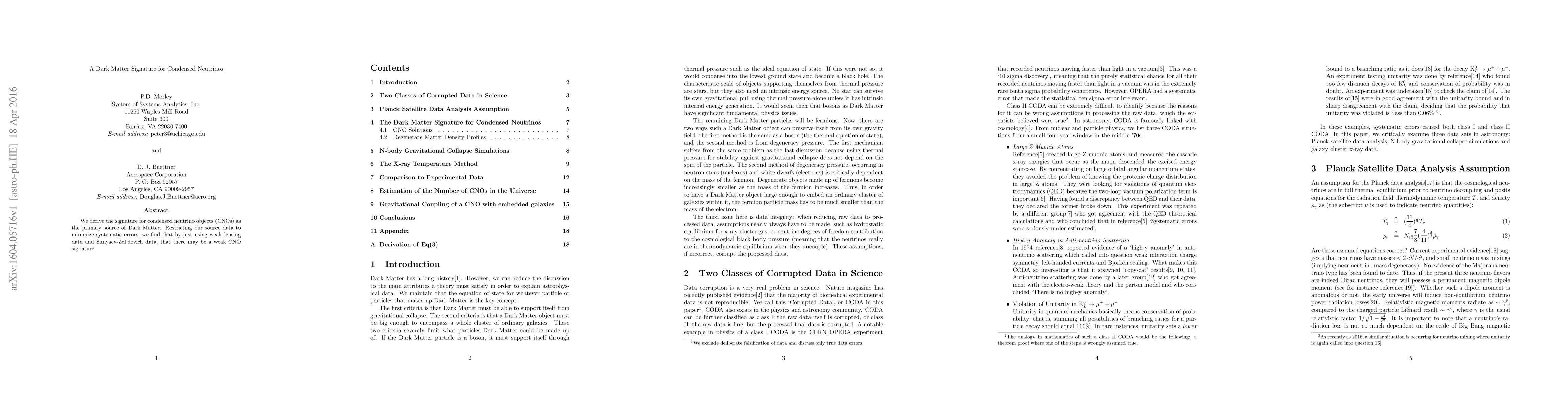 We derive the signature for condensed neutrino objects (CNOs) as the primary source of Dark Matter. Restricting our source data to minimize systematic errors, we find that by just using weak lensing data and Sunyaev-Zel'dovich data, that there may be a weak CNO signature.