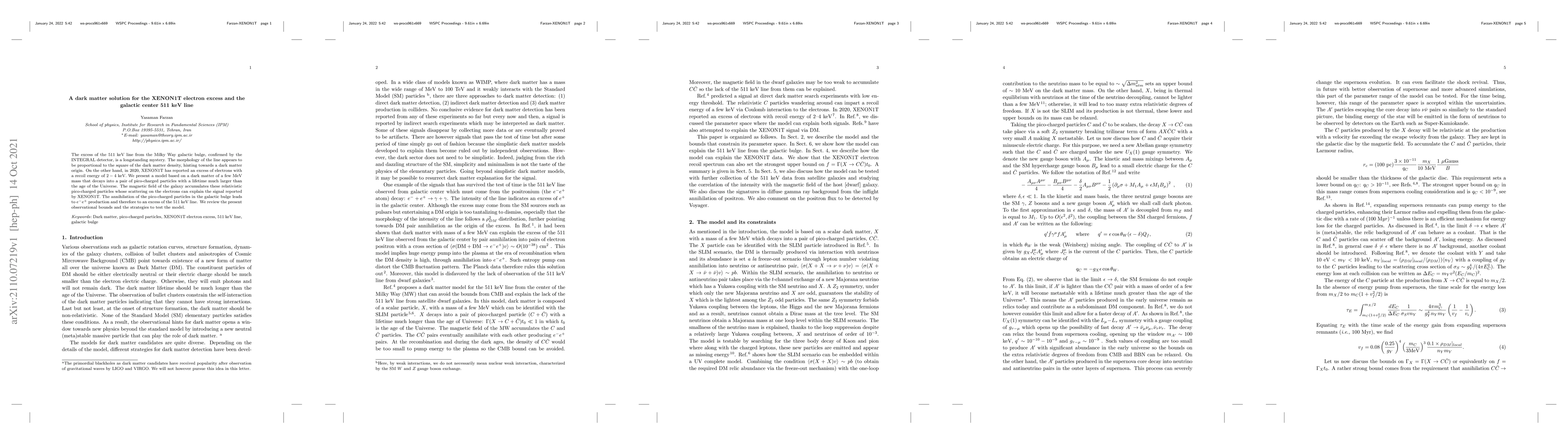 The excess of the 511 keV line from the Milky Way galactic bulge, confirmed by the INTEGRAL detector, is a longstanding mystery. The morphology of the line appears to be proportional to the square of the dark matter density, hinting towards a dark matter origin. On the other hand, in 2020, XENON1T has reported an excess of electrons with a recoil energy of $2-4$ keV. We present a model based on a dark matter of a few MeV mass that decays into a pair of pico-charged particles with a lifetime much larger than the age of the Universe. The magnetic field of the galaxy accumulates these relativistic pico-charged particles whose scattering on the electrons can explain the signal reported by XENON1T. The annihilation of the pico-charged particles in the galactic bulge leads to $e^-e^+$ production and therefore to an excess of the 511 keV line. We review the present observational bounds and the strategies to test the model.