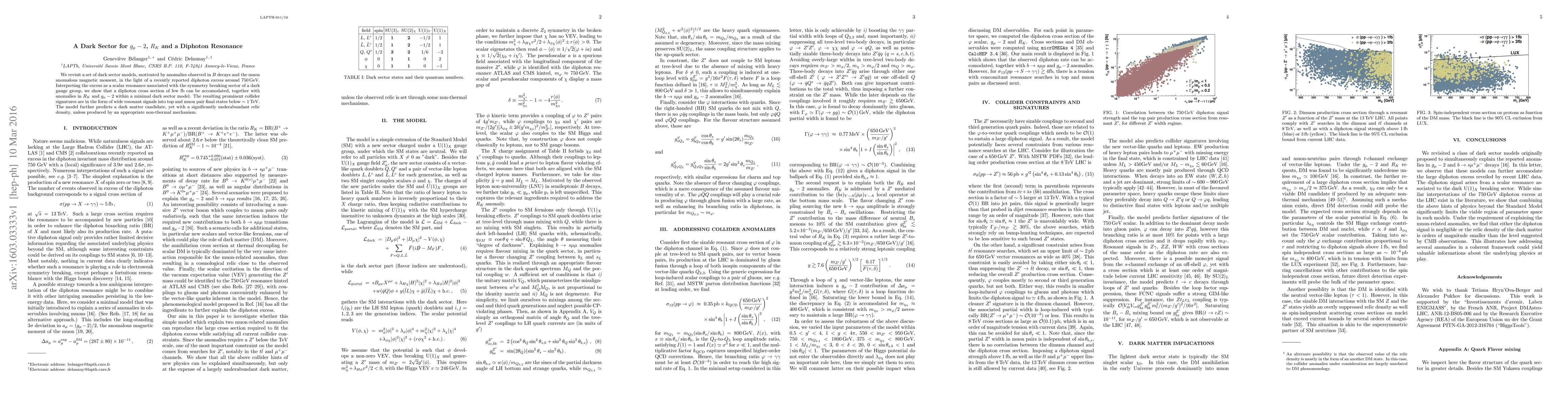 We revisit a set of dark sector models, motivated by anomalies observed in $B$ decays and the muon anomalous magnetic moment, in the light of a recently reported diphoton excess around 750$\,$GeV. Interpreting the excess as a scalar resonance associated with the symmetry breaking sector of a dark gauge group, we show that a diphoton cross section of few fb can be accomodated, together with anomalies in $R_K$ and $g_\mu-2$ within a minimal dark sector model. The resulting prominent collider signatures are in the form of wide resonant signals into top and muon pair final states below $\sim1\,$TeV. The model further predicts a dark matter candidate, yet with a significantly underabundant relic density, unless produced by an appropriate non-thermal mechanism.