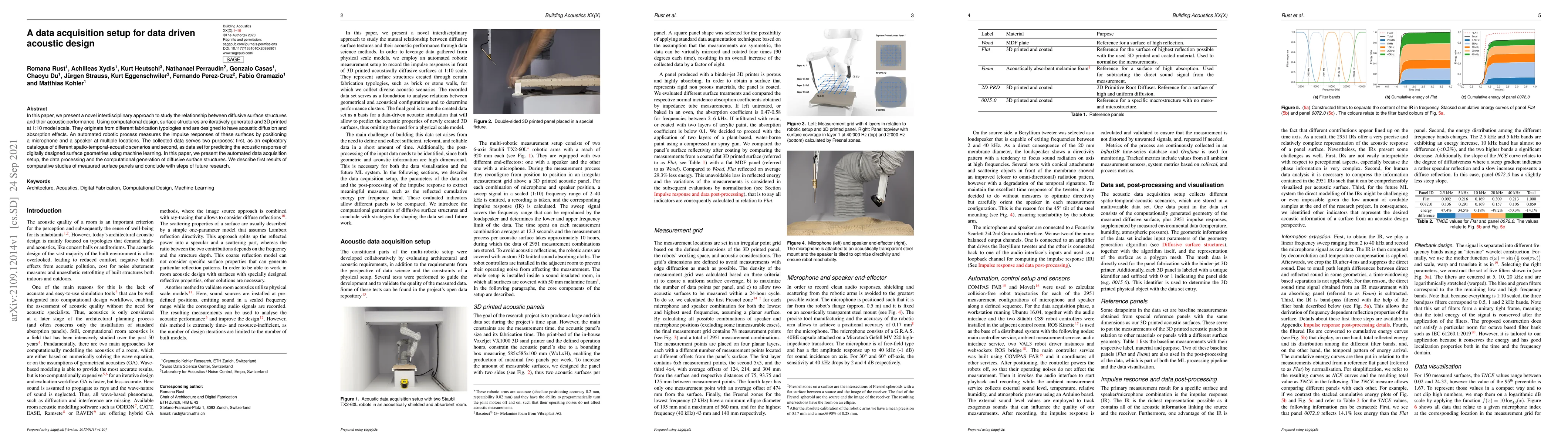 In this paper, we present a novel interdisciplinary approach to study the relationship between diffusive surface structures and their acoustic performance. Using computational design, surface structures are iteratively generated and 3D printed at 1:10 model scale. They originate from different fabrication typologies and are designed to have acoustic diffusion and absorption effects. An automated robotic process measures the impulse responses of these surfaces by positioning a microphone and a speaker at multiple locations. The collected data serves two purposes: first, as an exploratory catalogue of different spatio-temporal-acoustic scenarios and second, as data set for predicting the acoustic response of digitally designed surface geometries using machine learning. In this paper, we present the automated data acquisition setup, the data processing and the computational generation of diffusive surface structures. We describe first results of comparative studies of measured surface panels and conclude with steps of future research.