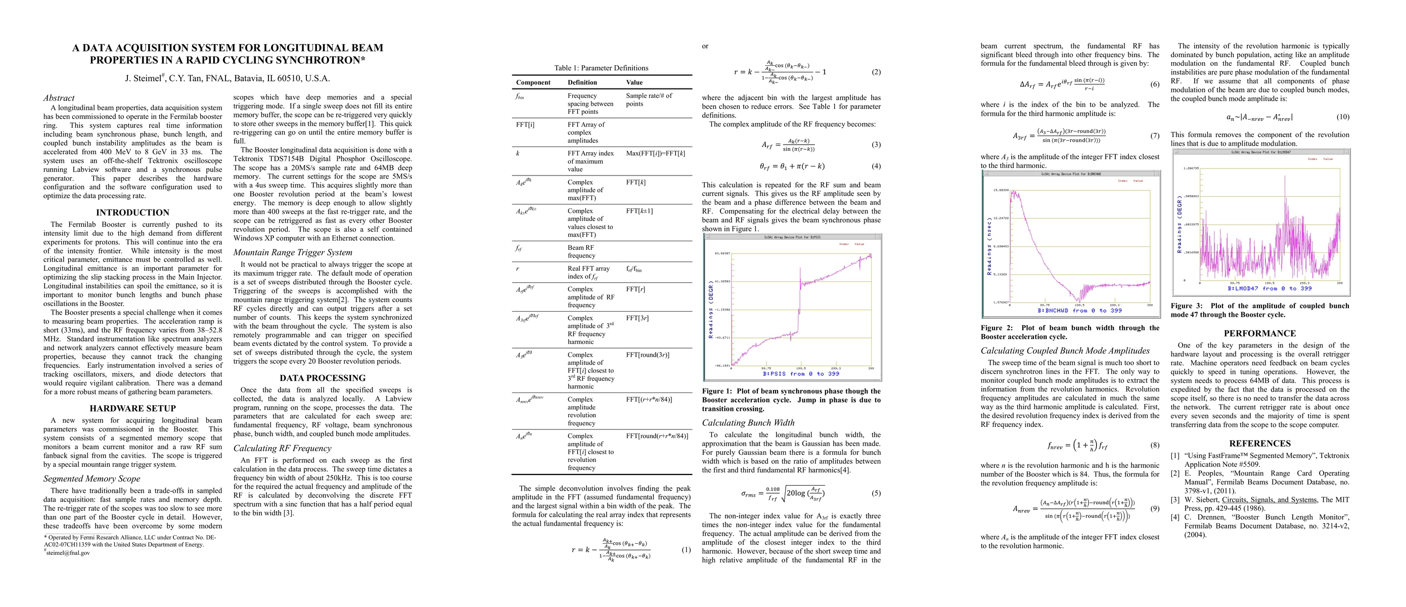 A longitudinal beam properties, data acquisition system has been commissioned to operate in the Fermilab booster ring. This system captures real time information including beam synchronous phase, bunch length, and coupled bunch instability amplitudes as the beam is accelerated from 400 MeV to 8 GeV in 33 ms. The system uses an off-the-shelf Tektronix oscilloscope running Labview software and a synchronous pulse generator. This paper describes the hardware configuration and the software configuration used to optimize the data processing rate.