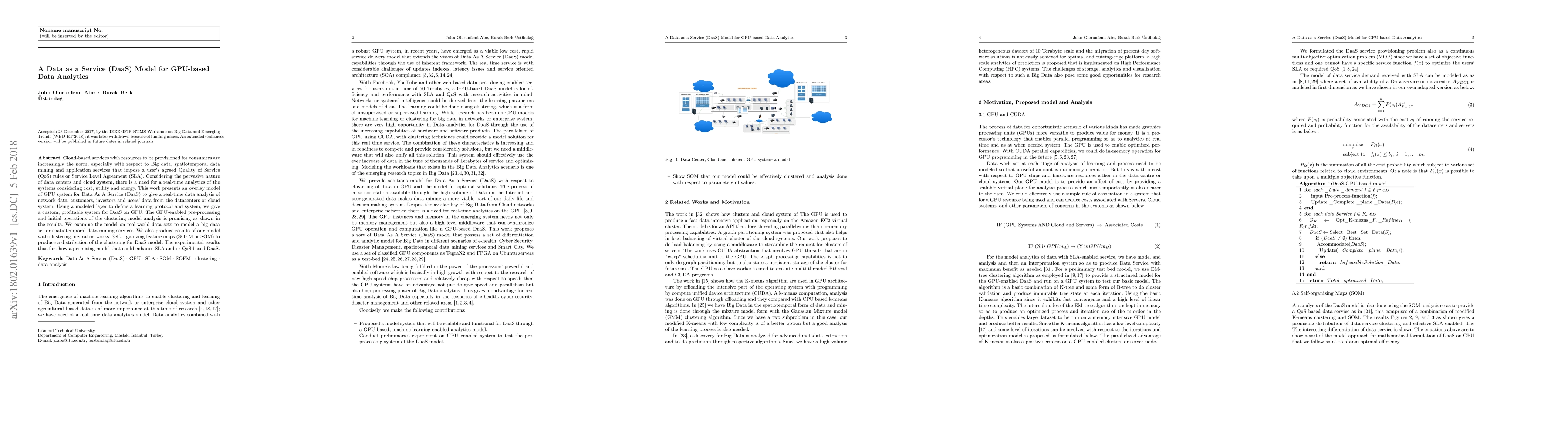 Cloud-based services with resources to be provisioned for consumers are increasingly the norm, especially with respect to Big data, spatiotemporal data mining and application services that impose a user's agreed Quality of Service (QoS) rules or Service Level Agreement (SLA). Considering the pervasive nature of data centers and cloud system, there is a need for a real-time analytics of the systems considering cost, utility and energy. This work presents an overlay model of GPU system for Data As A Service (DaaS) to give a real-time data analysis of network data, customers, investors and users' data from the datacenters or cloud system. Using a modeled layer to define a learning protocol and system, we give a custom, profitable system for DaaS on GPU. The GPU-enabled pre-processing and initial operations of the clustering model analysis is promising as shown in the results. We examine the model on real-world data sets to model a big data set or spatiotemporal data mining services. We also produce results of our model with clustering, neural networks' Self-organizing feature maps (SOFM or SOM) to produce a distribution of the clustering for DaaS model. The experimental results thus far show a promising model that could enhance SLA and or QoS based DaaS.