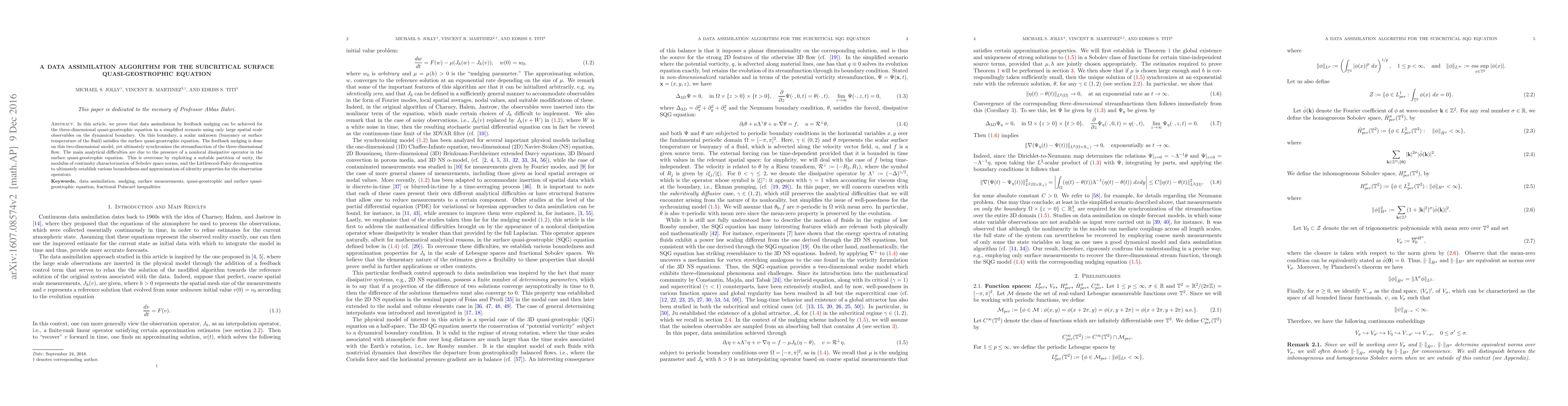 This paper develops a data assimilation algorithm for the subcritical surface quasi-geostrophic equation using feedback nudging with large spatial scale observables. It overcomes analytical challenges posed by a nonlocal dissipative operator through the use of partition of unity and Littlewood-Paley decomposition.