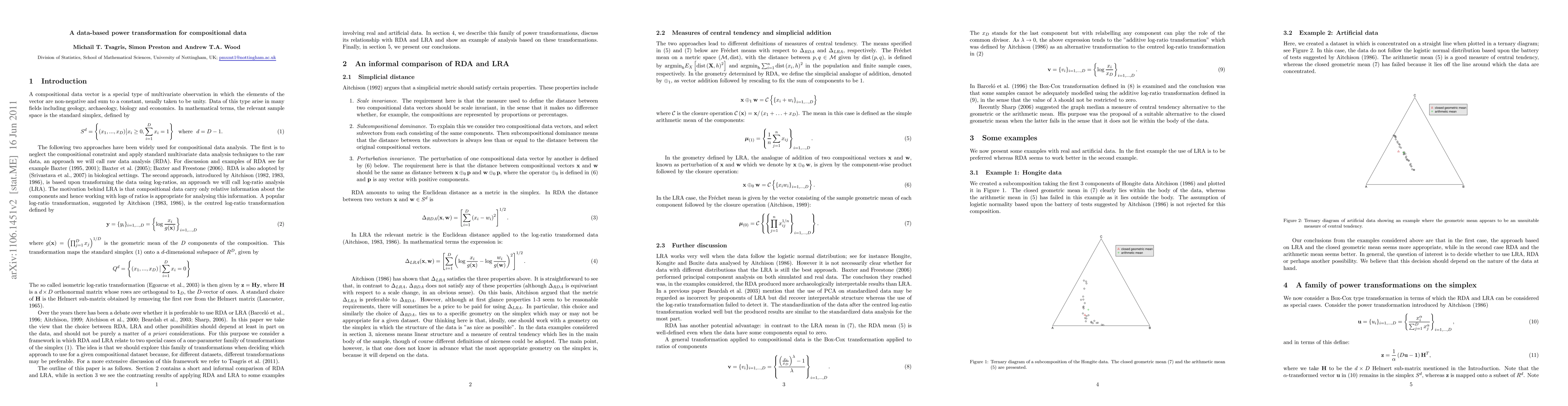 The paper proposes a data-based power transformation for compositional data, introducing a single-parameter transformation involving a Box-Cox type approach and an equivalent stay-in-the-simplex version. It discusses methods for estimating the transformation parameter α, including profile likelihood maximization, classification probability maximization, and pseudo R-squared maximization in regression.