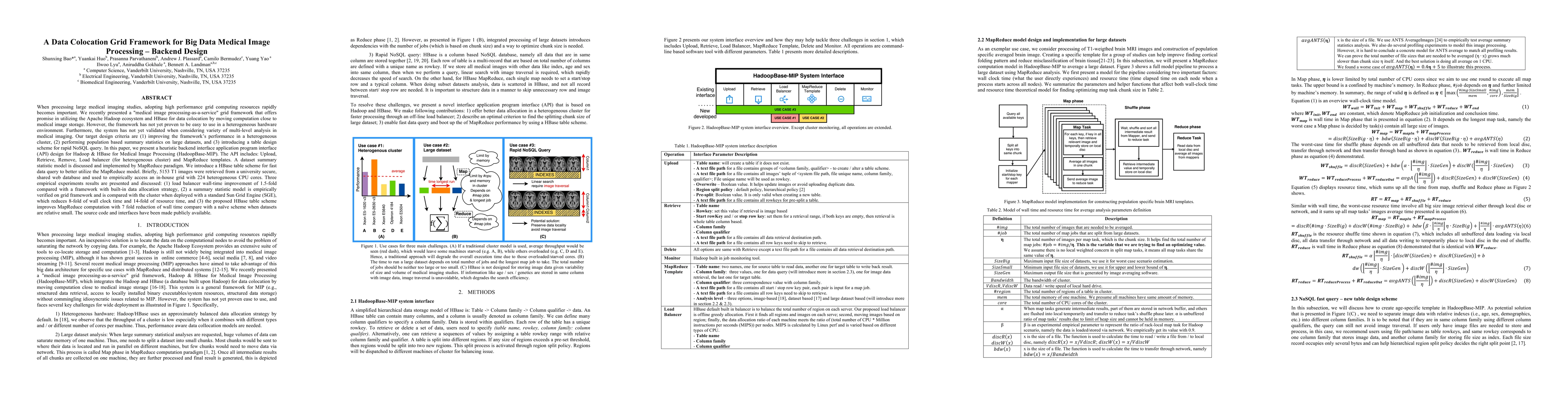 When processing large medical imaging studies, adopting high performance grid computing resources rapidly becomes important. We recently presented a "medical image processing-as-a-service" grid framework that offers promise in utilizing the Apache Hadoop ecosystem and HBase for data colocation by moving computation close to medical image storage. However, the framework has not yet proven to be easy to use in a heterogeneous hardware environment. Furthermore, the system has not yet validated when considering variety of multi-level analysis in medical imaging. Our target criteria are (1) improving the framework's performance in a heterogeneous cluster, (2) performing population based summary statistics on large datasets, and (3) introducing a table design scheme for rapid NoSQL query. In this paper, we present a backend interface application program interface design for Hadoop & HBase for Medical Image Processing. The API includes: Upload, Retrieve, Remove, Load balancer and MapReduce templates. A dataset summary statistic model is discussed and implemented by MapReduce paradigm. We introduce a HBase table scheme for fast data query to better utilize the MapReduce model. Briefly, 5153 T1 images were retrieved from a university secure database and used to empirically access an in-house grid with 224 heterogeneous CPU cores. Three empirical experiments results are presented and discussed: (1) load balancer wall-time improvement of 1.5-fold compared with a framework with built-in data allocation strategy, (2) a summary statistic model is empirically verified on grid framework and is compared with the cluster when deployed with a standard Sun Grid Engine, which reduces 8-fold of wall clock time and 14-fold of resource time, and (3) the proposed HBase table scheme improves MapReduce computation with 7 fold reduction of wall time compare with a na\"ive scheme when datasets are relative small.