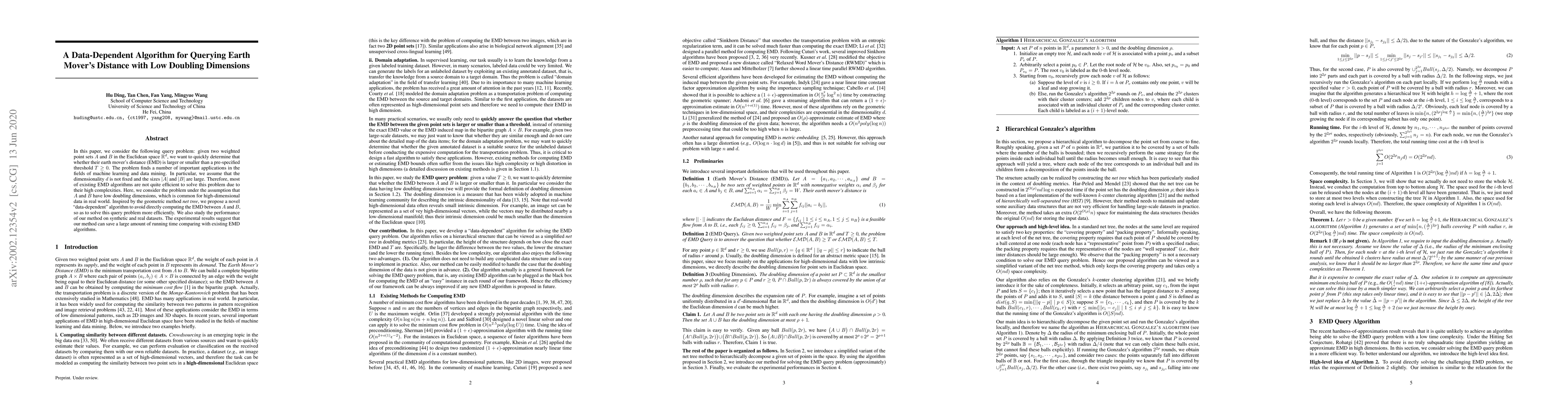 This paper proposes a new algorithm to efficiently query earth mover's distance between two weighted point sets with low doubling dimensions, reducing computation time compared to existing methods.