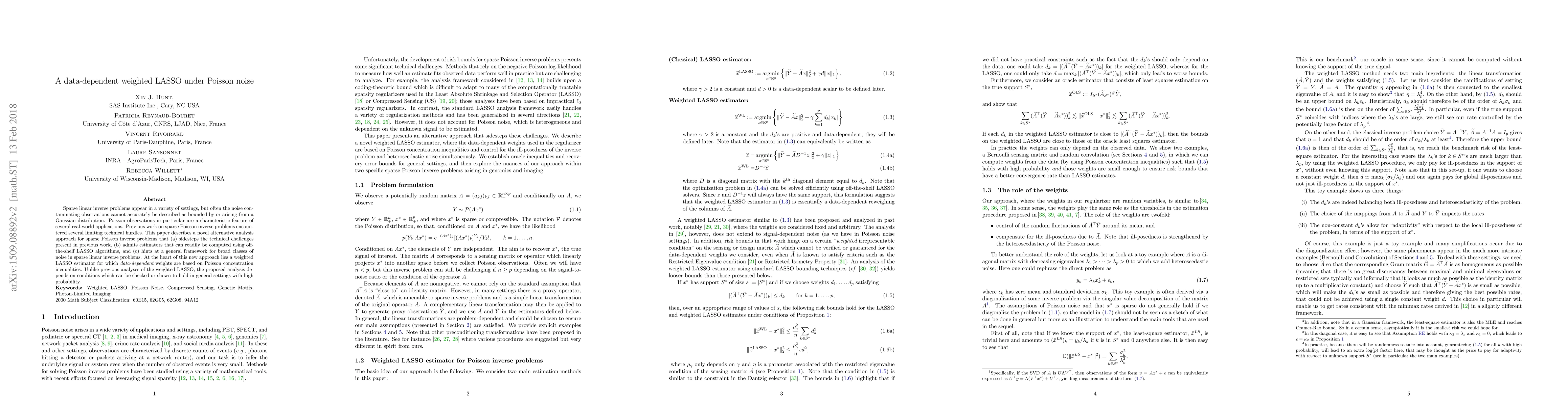 This paper introduces a novel weighted LASSO method for sparse linear inverse problems under Poisson noise, overcoming technical challenges in previous analyses. The approach allows for straightforward computation using existing LASSO algorithms and provides a general framework for various noise types.