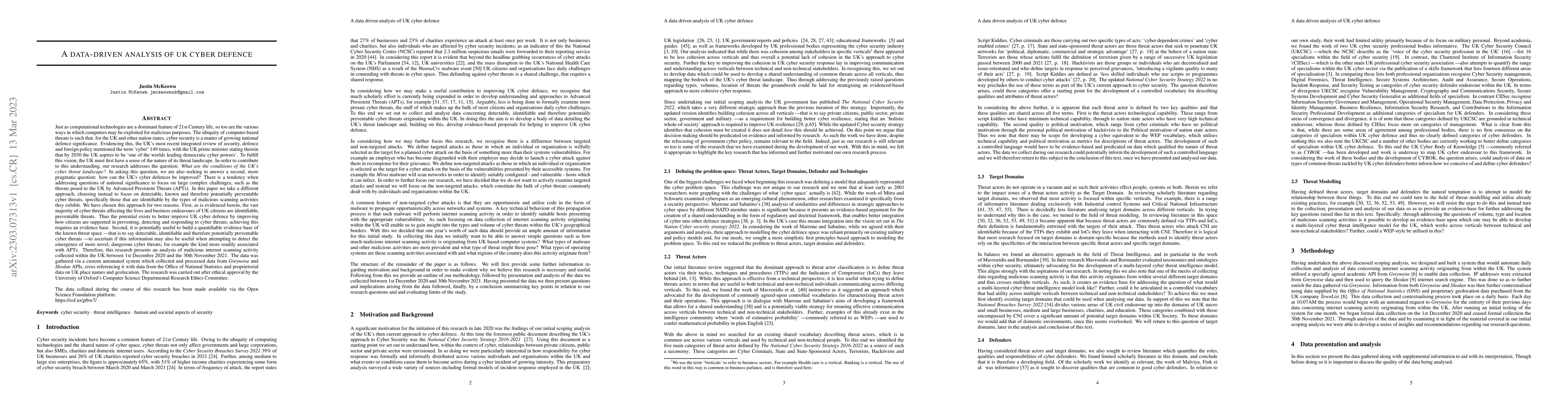 This research analyzes UK cyber threats through a data-driven approach focusing on detectable, known malicious scanning activities to improve UK cyber defence. The study provides a quantifiable evidence base for policy makers to better support citizens in preventing and responding to cyber threats.