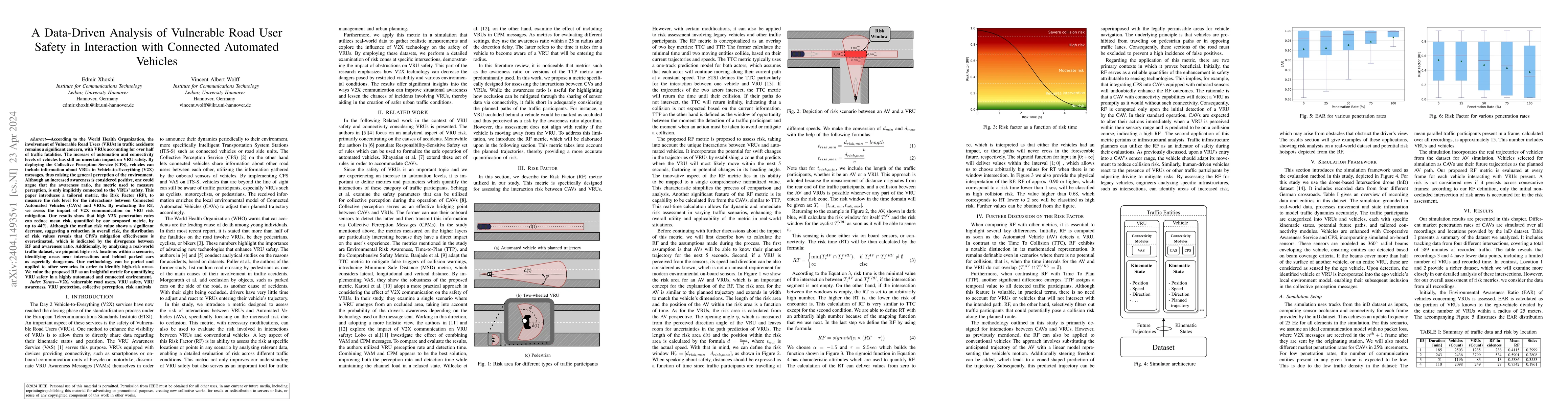 This research introduces a new metric, the Risk Factor (RF), to evaluate the safety of Vulnerable Road Users (VRUs) interacting with Connected Automated Vehicles (CAVs). The study shows that high V2X penetration can reduce overall VRU risk by up to 44%, although the effectiveness of mitigation is overestimated compared to awareness ratio. The research identifies high-risk locations near intersections and behind parked cars using real-world traffic data.