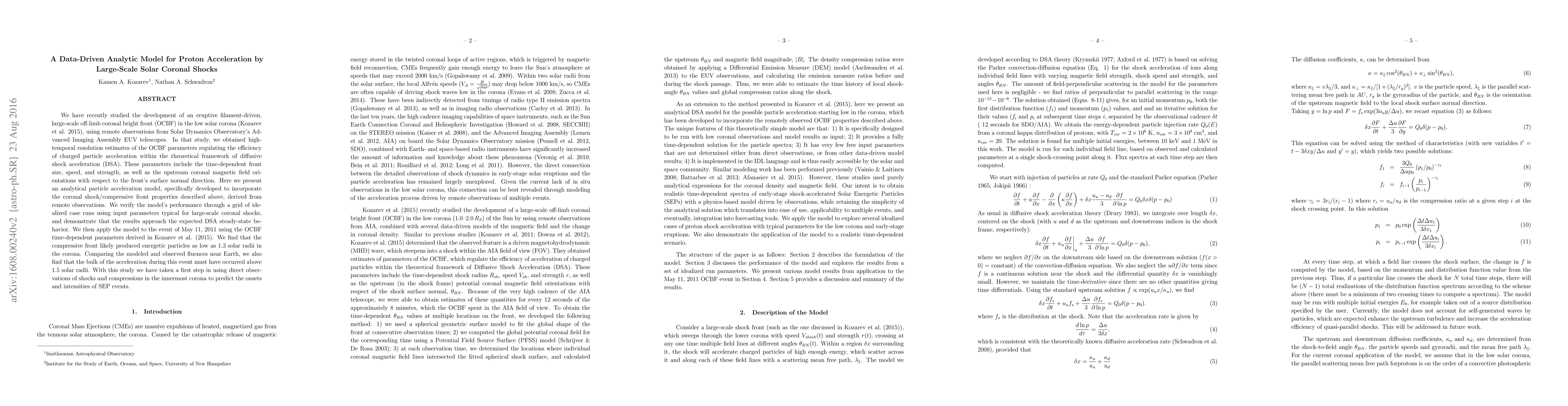 We have recently studied the development of an eruptive filament-driven, large-scale off-limb coronal bright front (OCBF) in the low solar corona (Kozarev et al. 2015), using remote observations from Solar Dynamics Observatory's Advanced Imaging Assembly EUV telescopes. In that study, we obtained high-temporal resolution estimates of the OCBF parameters regulating the efficiency of charged particle acceleration within the theoretical framework of diffusive shock acceleration (DSA). These parameters include the time-dependent front size, speed, and strength, as well as the upstream coronal magnetic field orientations with respect to the front's surface normal direction. Here we present an analytical particle acceleration model, specifically developed to incorporate the coronal shock/compressive front properties described above, derived from remote observations. We verify the model's performance through a grid of idealized case runs using input parameters typical for large-scale coronal shocks, and demonstrate that the results approach the expected DSA steady-state behavior. We then apply the model to the event of May 11, 2011 using the OCBF time-dependent parameters derived in Kozarev et al. (2015). We find that the compressive front likely produced energetic particles as low as 1.3 solar radii in the corona. Comparing the modeled and observed fluences near Earth, we also find that the bulk of the acceleration during this event must have occurred above 1.5 solar radii. With this study we have taken a first step in using direct observations of shocks and compressions in the innermost corona to predict the onsets and intensities of SEP events.