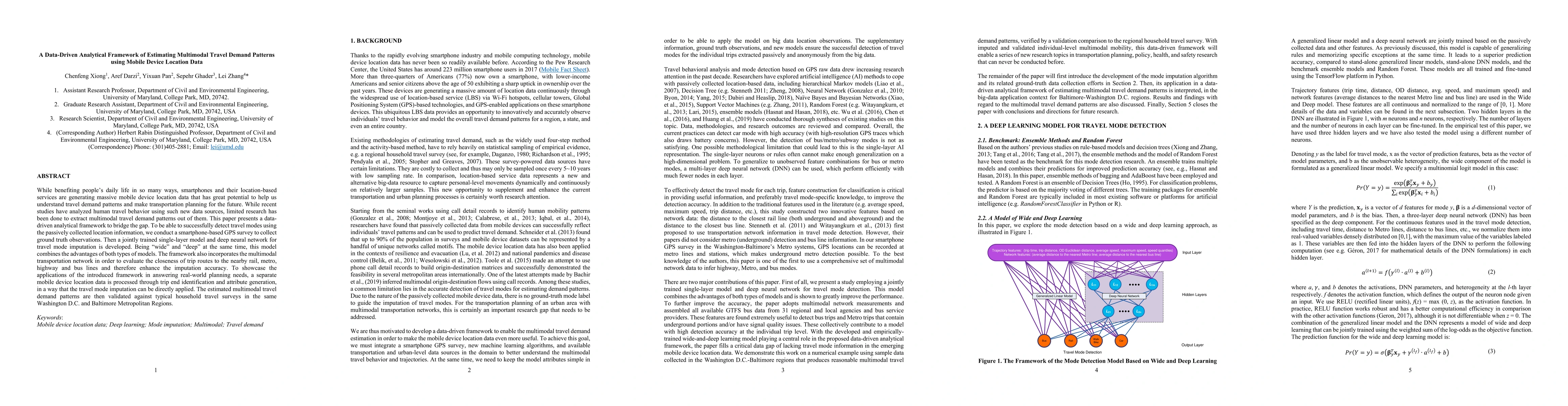 This paper introduces a data-driven analytical framework to estimate multimodal travel demand patterns using mobile device location data. It combines a smartphone-based GPS survey with a jointly trained model to accurately detect travel modes and evaluates trip routes against multimodal transportation networks for enhanced accuracy.