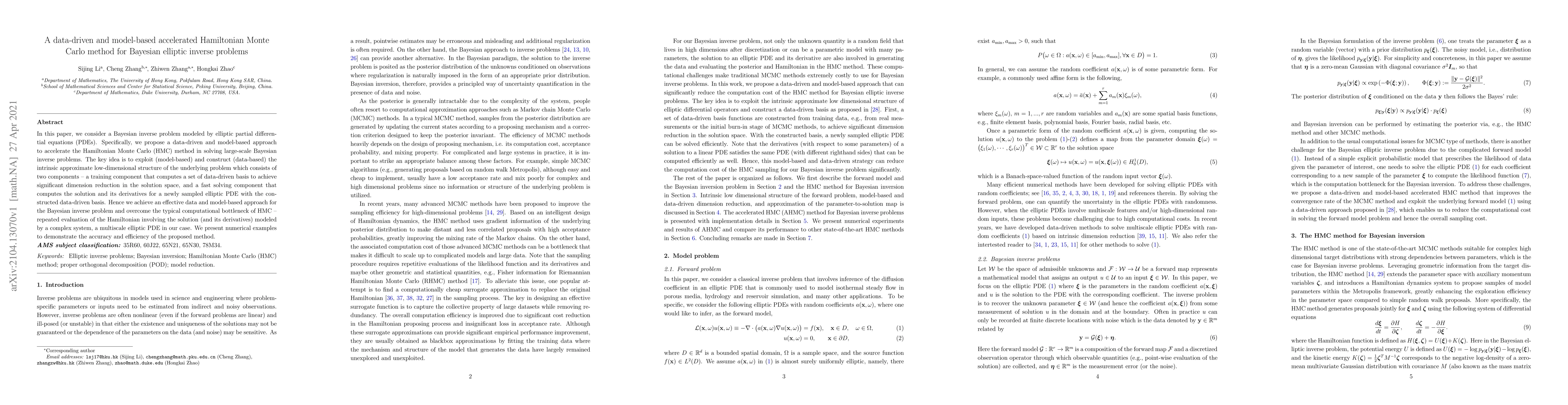 This paper proposes an accelerated Hamiltonian Monte Carlo (HMC) method for solving large-scale Bayesian inverse problems modeled by elliptic partial differential equations (PDEs). The approach combines model-based and data-driven techniques to exploit intrinsic low-dimensional structures, significantly reducing computational costs and demonstrating improved accuracy and efficiency through numerical examples.