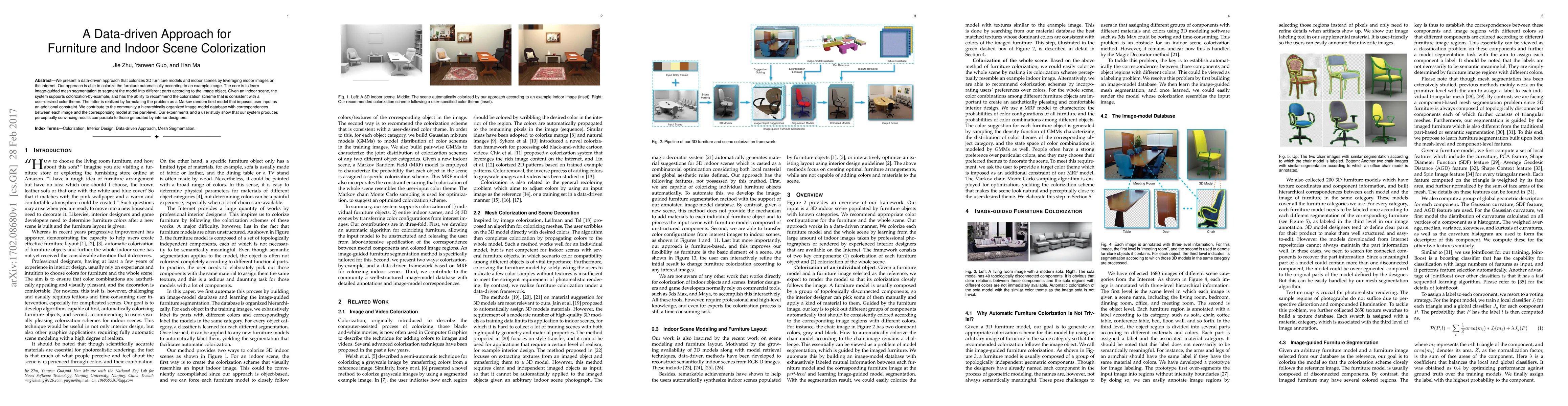 This paper introduces a data-driven method for automatically colorizing 3D furniture models and indoor scenes based on example images, utilizing a learned image-guided mesh segmentation. The system also supports colorization-by-example and user-defined color themes through a Markov random field model, contributing a part-level image-model database for future research.