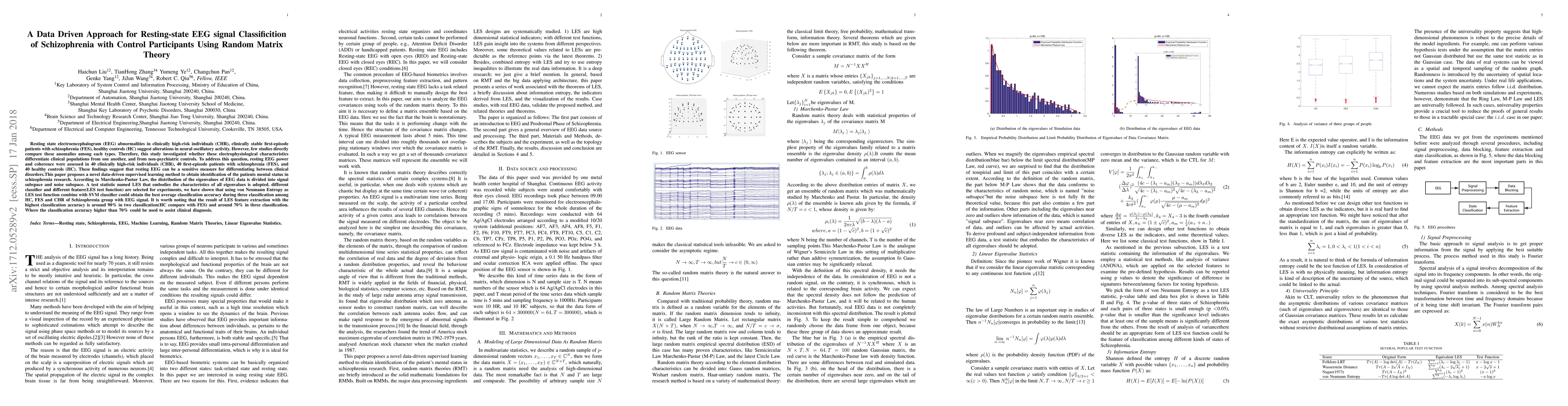 Resting state electroencephalogram (EEG) abnormalities in clinically high-risk individuals (CHR), clinically stable first-episode patients with schizophrenia (FES), healthy controls (HC) suggest alterations in neural oscillatory activity. However, few studies directly compare these anomalies among each types. Therefore, this study investigated whether these electrophysiological characteristics differentiate clinical populations from one another, and from non-psychiatric controls. To address this question, resting EEG power and coherence were assessed in 40 clinically high-risk individuals (CHR), 40 first-episode patients with schizophrenia (FES), and 40 healthy controls (HC). These findings suggest that resting EEG can be a sensitive measure for differentiating between clinical disorders.This paper proposes a novel data-driven supervised learning method to obtain identification of the patients mental status in schizophrenia research. According to Marchenko-Pastur Law, the distribution of the eigenvalues of EEG data is divided into signal subspace and noise subspace. A test statistic named LES that embodies the characteristics of all eigenvalues is adopted. different classifier and different feature(LES test function) are selected for experiments, we have shown that using von Neumann Entropy as LES test function combine with SVM classifier could obtain the best average classification accuracy during three classification among HC, FES and CHR of Schizophrenia group with EEG signal. It is worth noting that the result of LES feature extraction with the highest classification accuracy is around 90% in two classification(HC compare with FES) and around 70% in three classification. Where the classification accuracy higher than 70% could be used to assist clinical diagnosis.